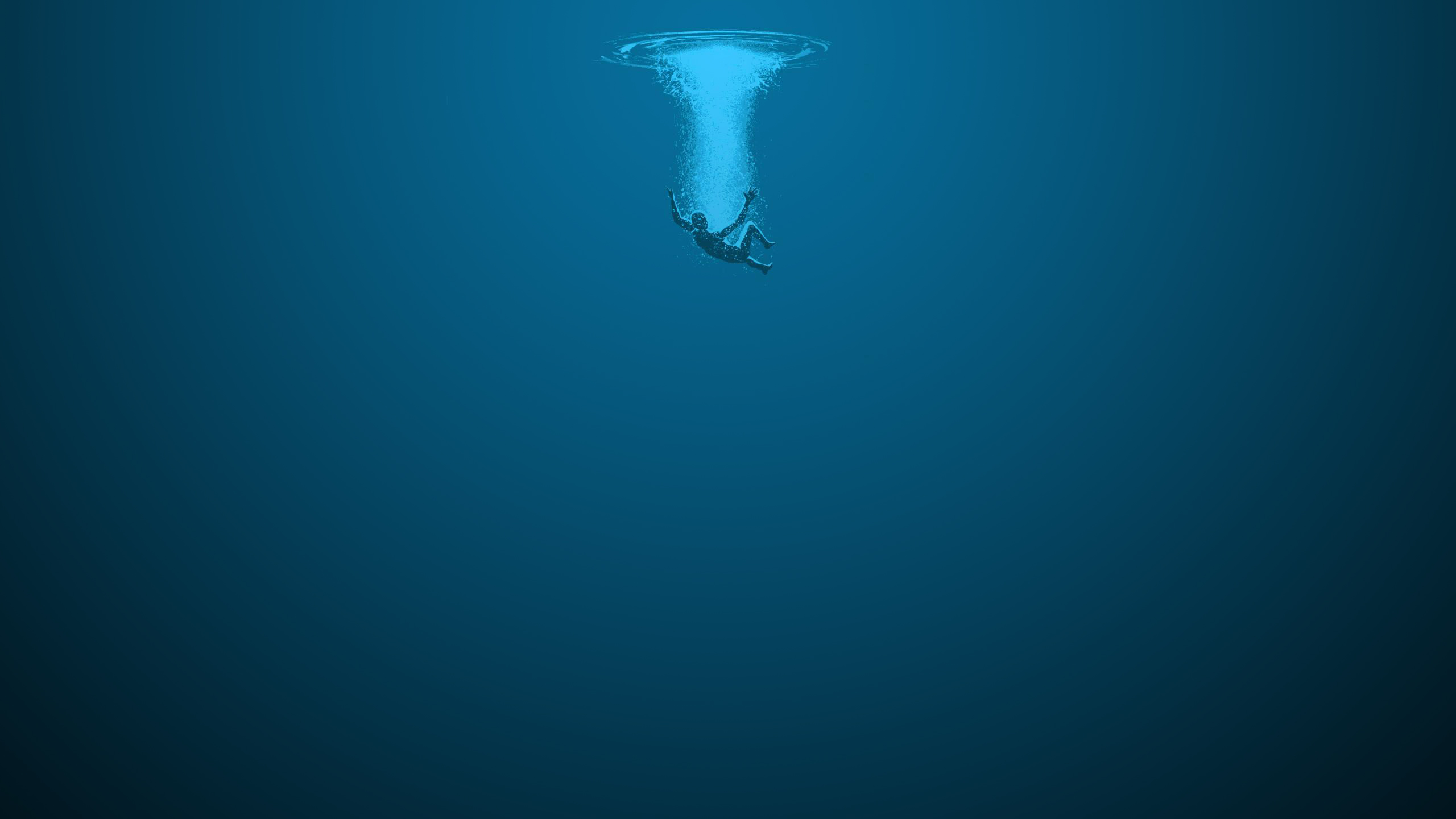 Description: A blue ocean with a large wave coming out of the water and a person in the water below it.