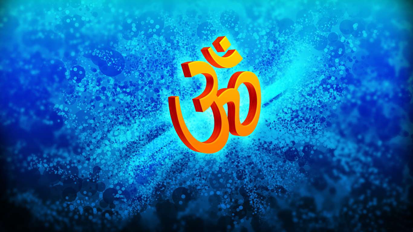 Description: A blue and orange om shan symbol on a blue background with bubbles of water and bubbles of light around it.