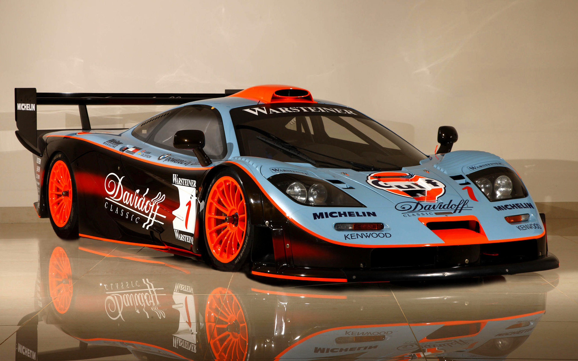 Description: A blue and orange race car on a shiny surface with a reflection on the floor and a wall behind it.