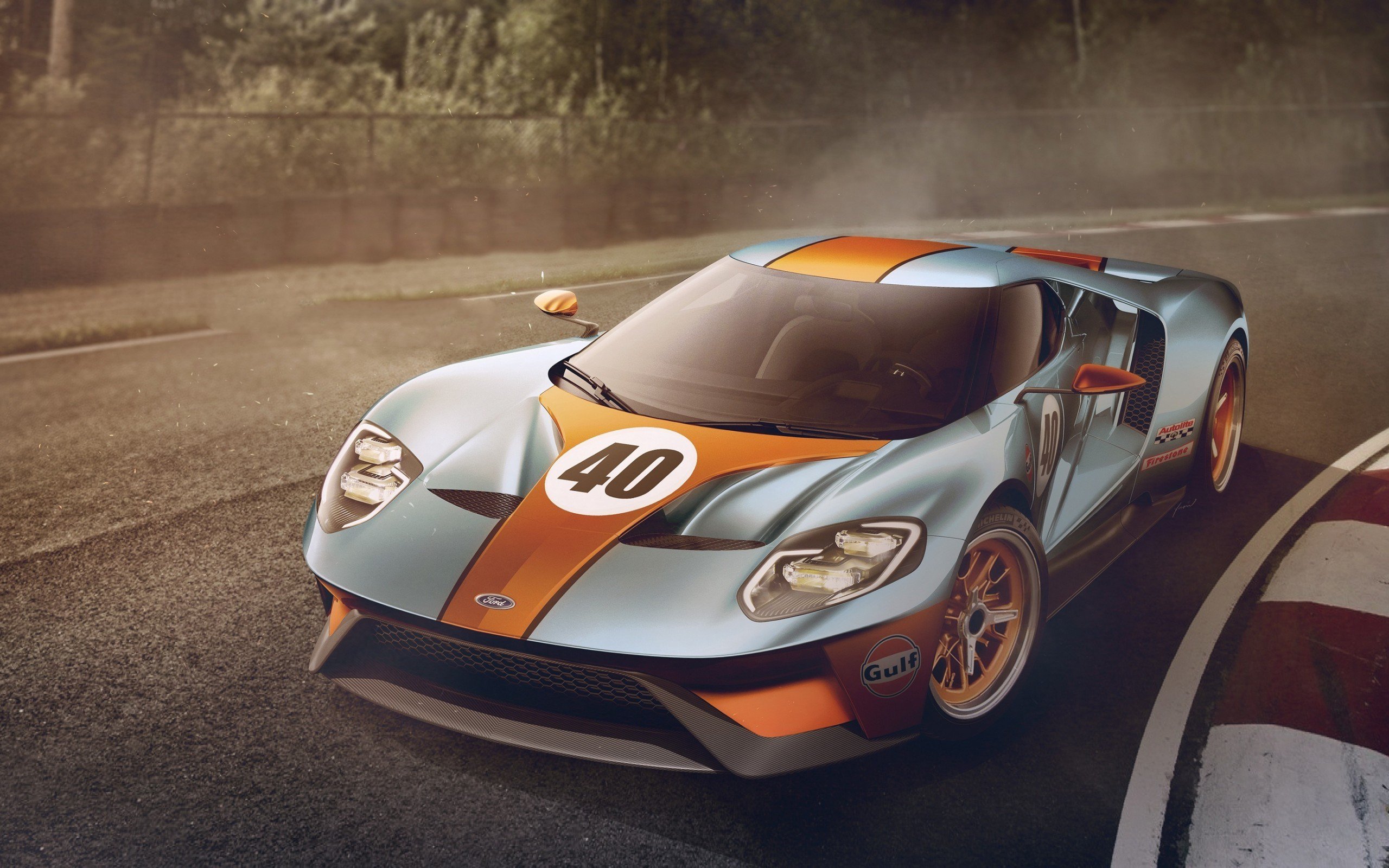 Description: A blue and orange sports car driving down a road next to a forest on a foggy day with a number 40 on the front.