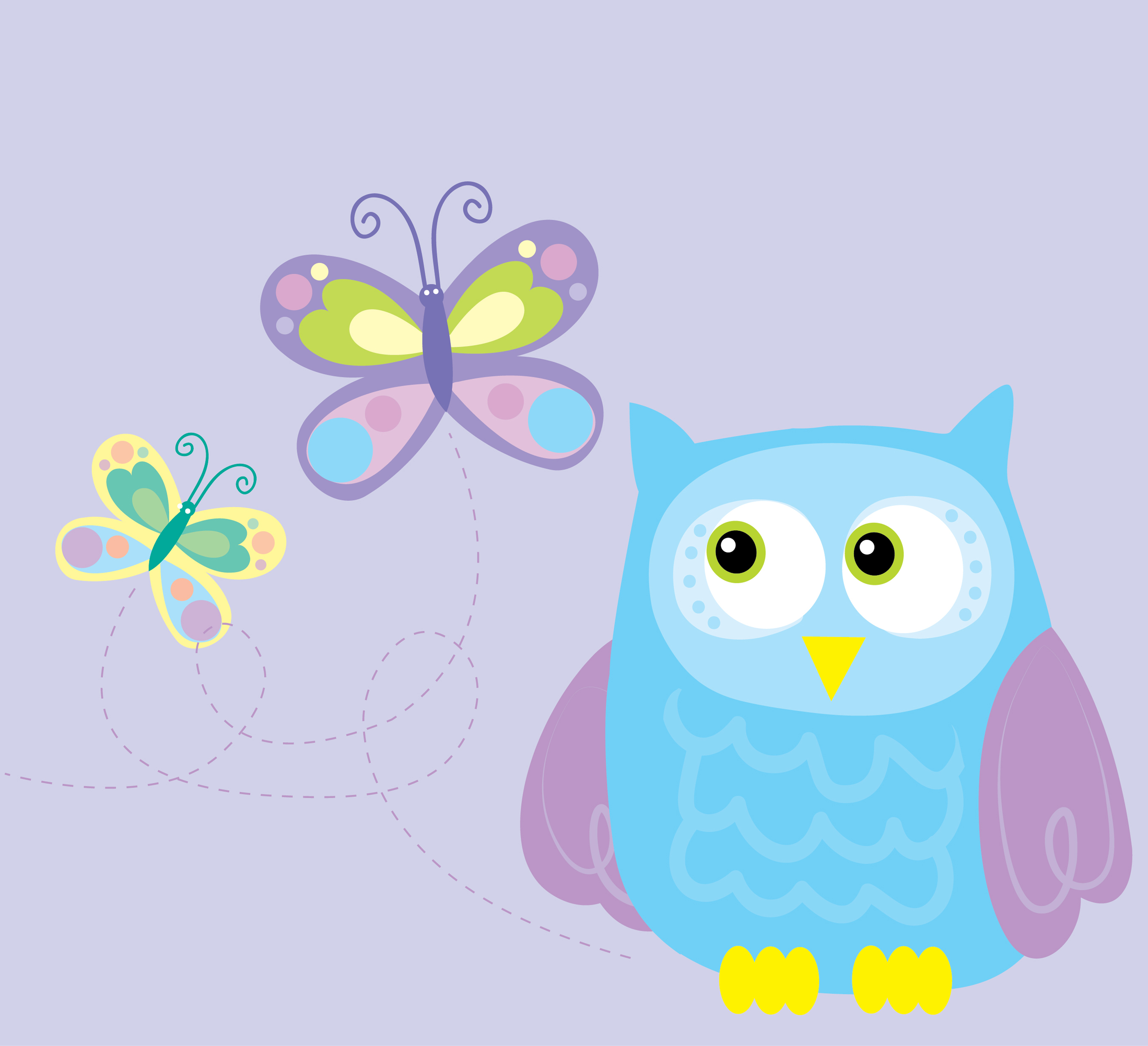 Description: A blue owl and a butterfly on a purple background with a white outline of a butterfly on the left side of the image.