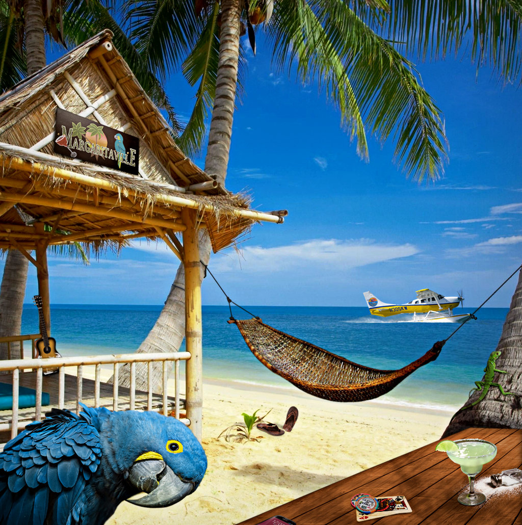 Description: A blue parrot sitting in a hammock on a beach next to a boat and a palm tree.
