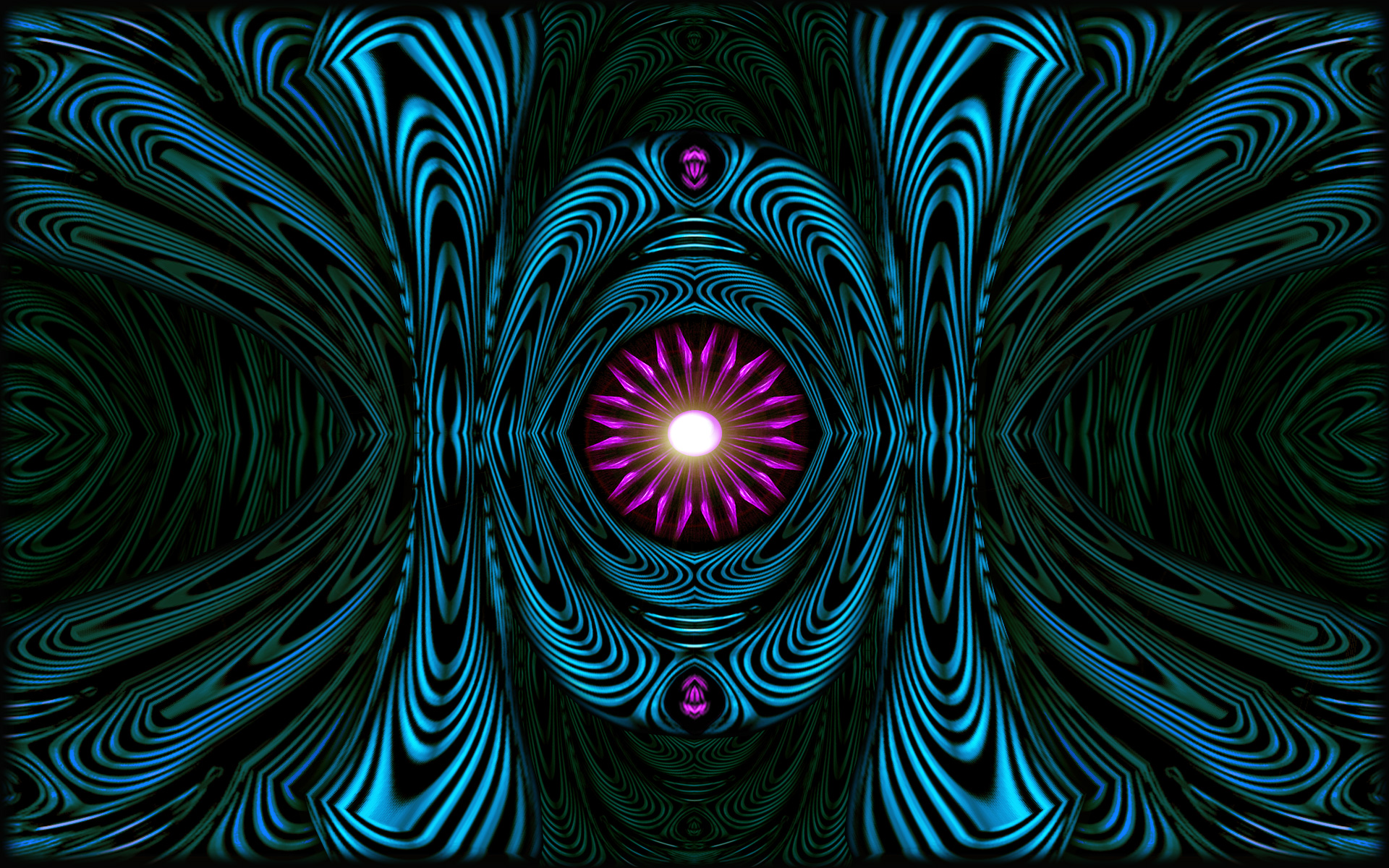 Description: A blue and pink abstract design with a light in the center of the image and a black background with a white center.