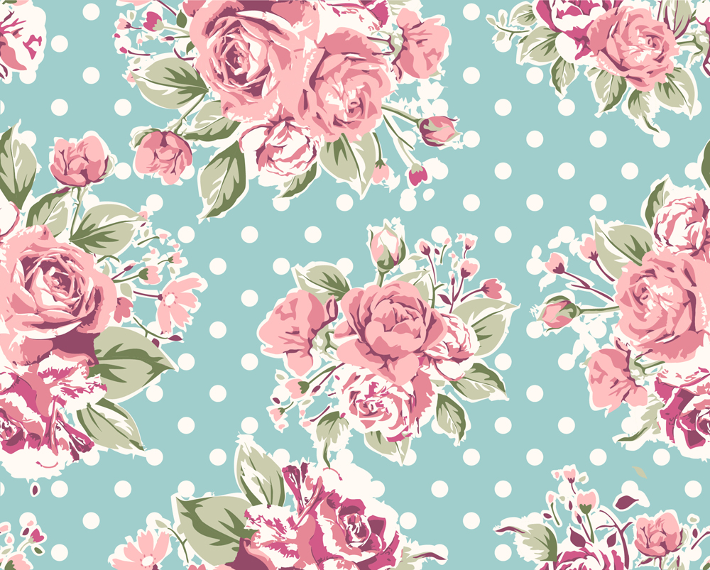 Description: A blue and pink flowered wallpaper with polka dots and dots on it.