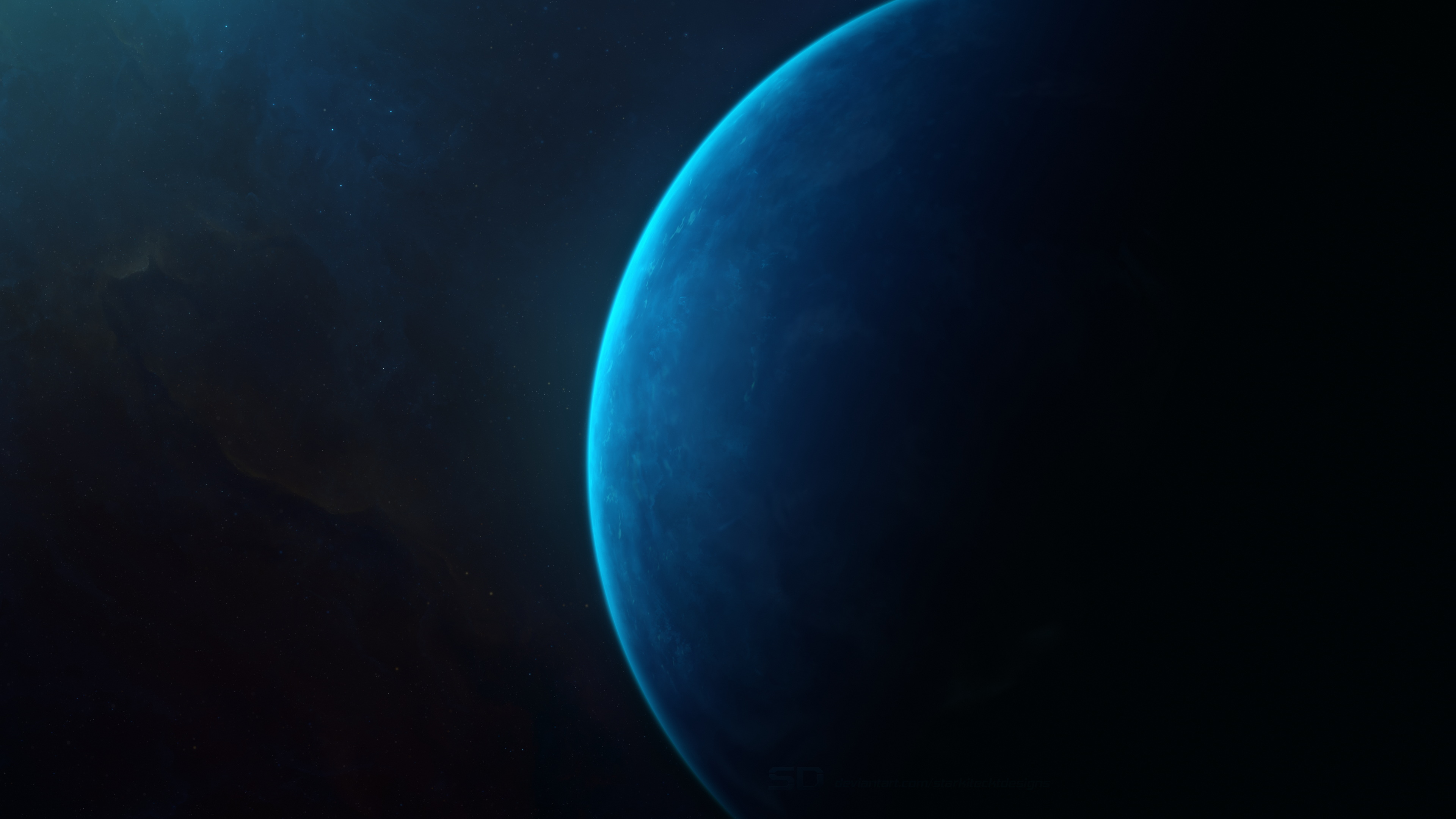 Description: A blue planet with a dark background and a bright light shining on it's side.