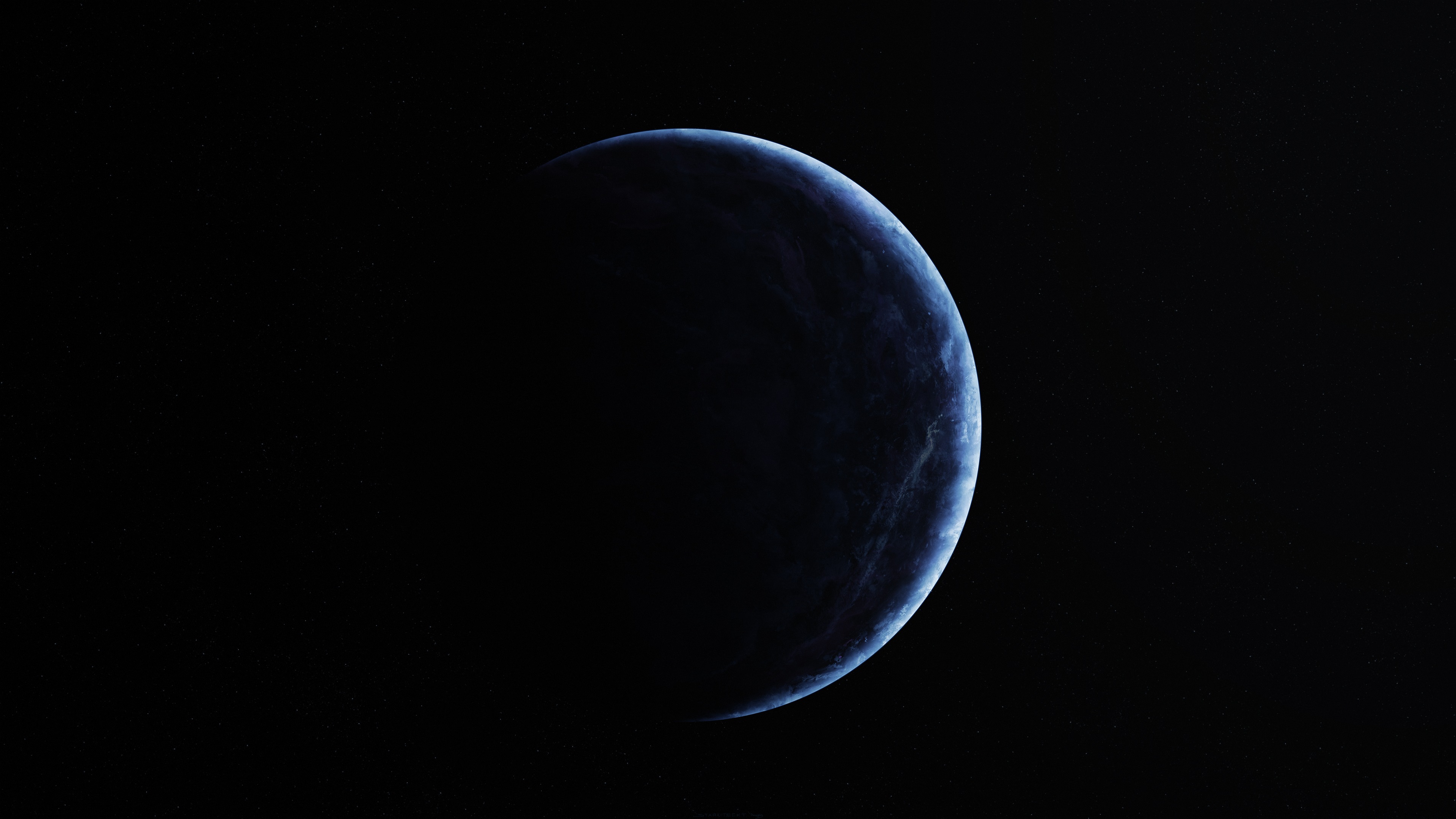 Description: A blue planet with a dark background and a dark sky background with a small amount of light from the sun.