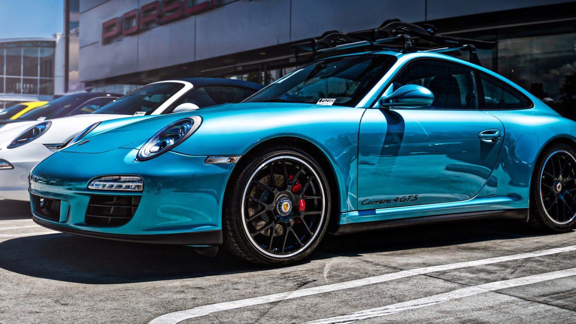 Description: A blue porsche parked in a parking lot next to other cars in a parking lot with a building in the background.