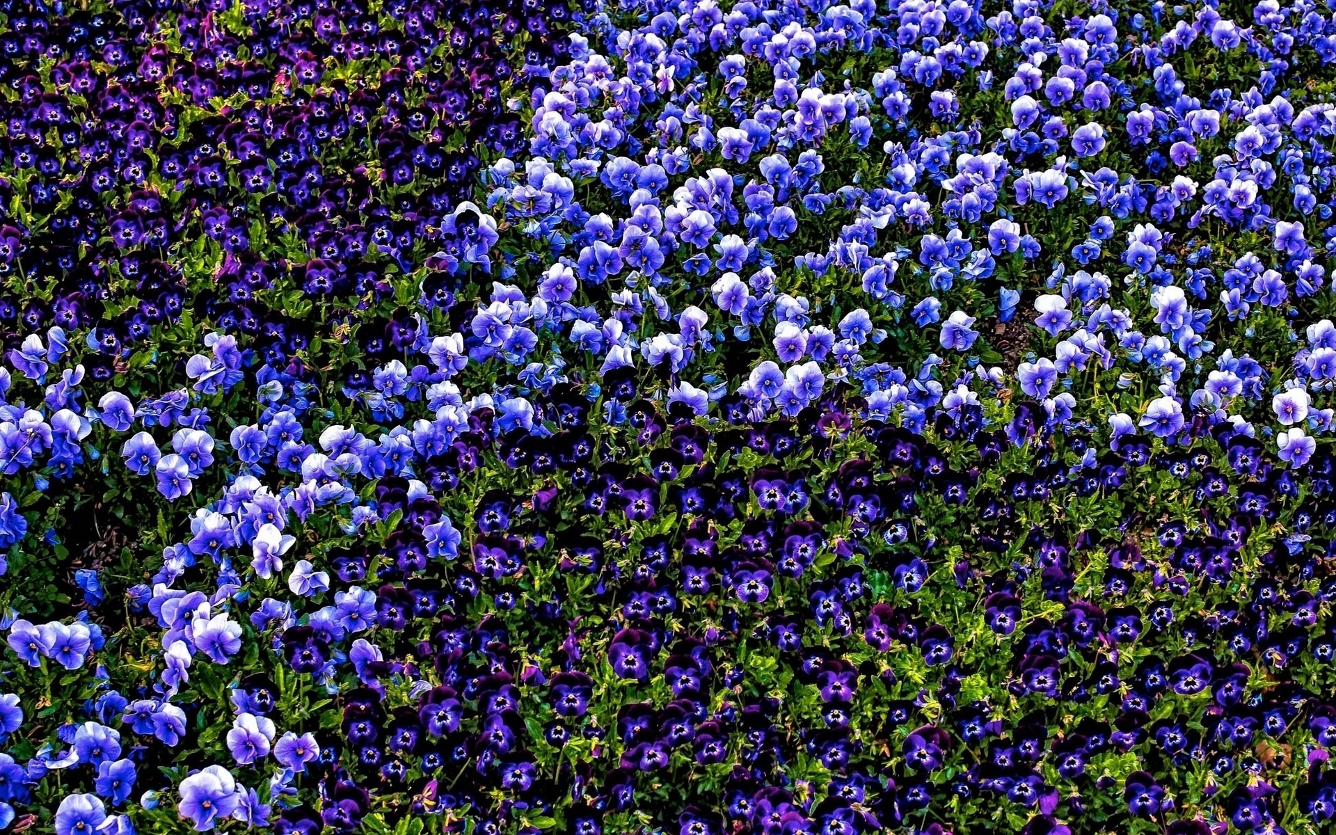 Description: A field of blue and purple flowers with green leaves and stems in the foreground and a green field in the background.