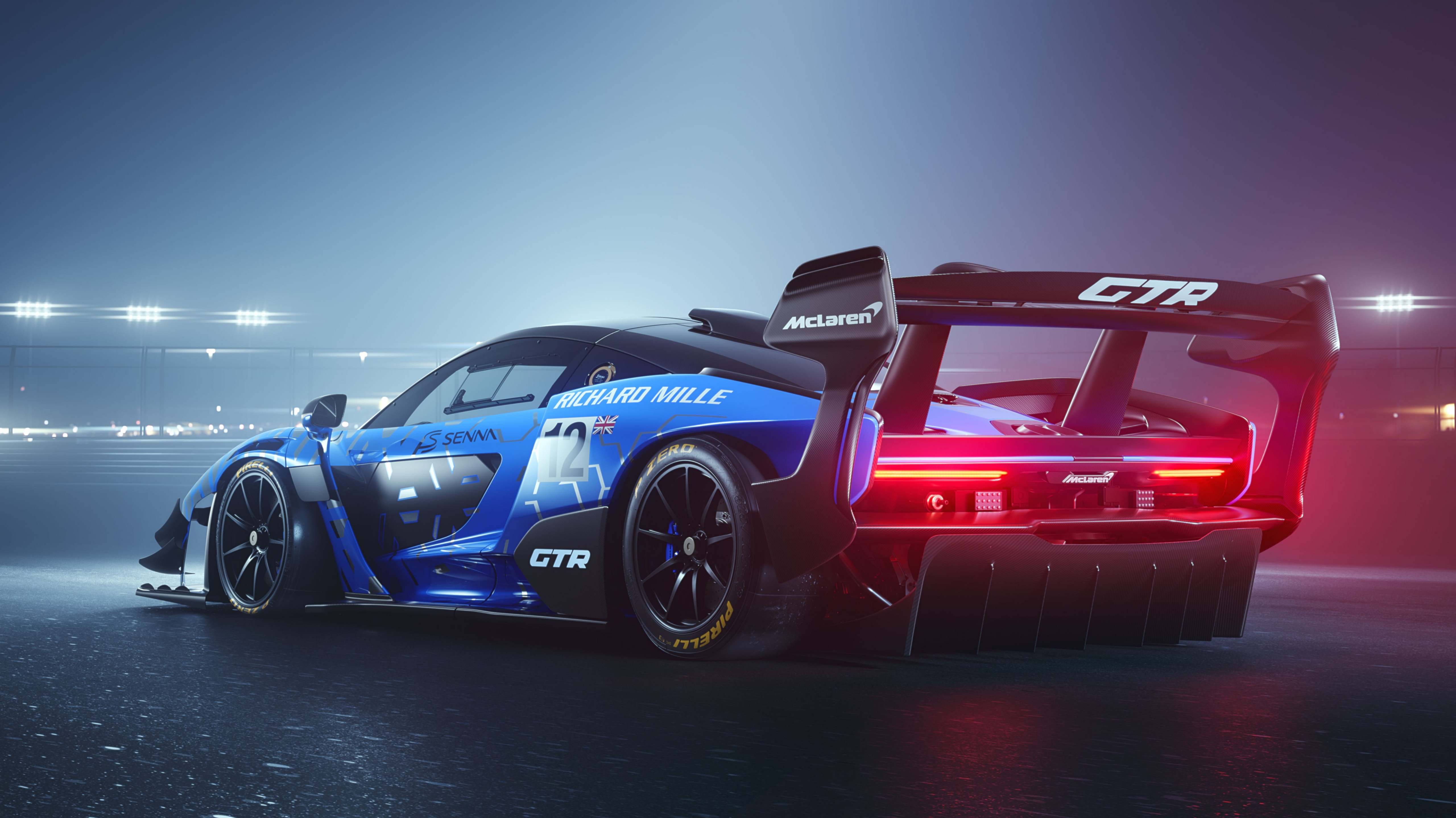 Description: A blue race car with a red tail light on it's side in a darkened stadium area with lights on.