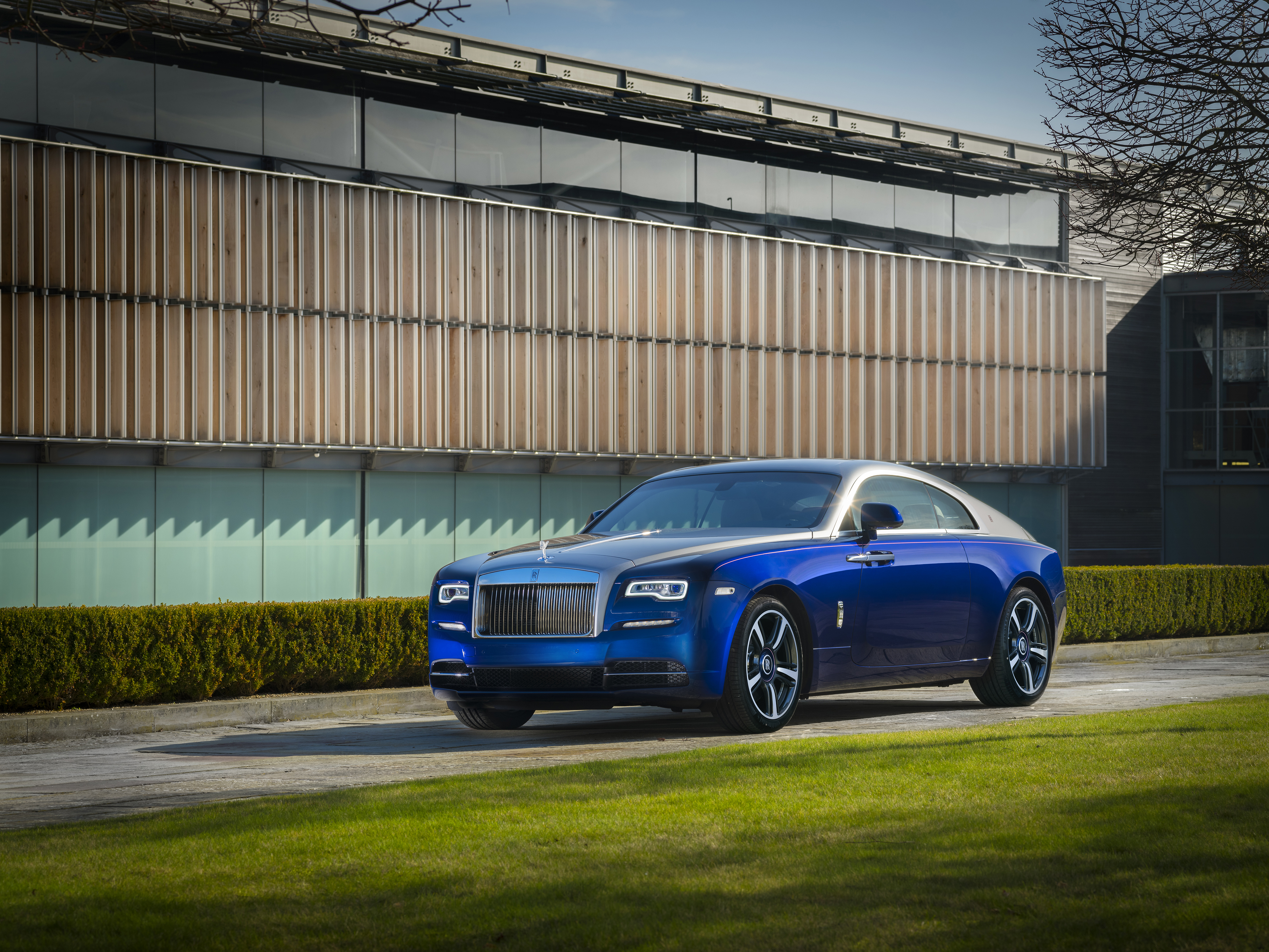 Description: A blue rolls royce parked in front of a building with a green lawn and a tree in front of it.