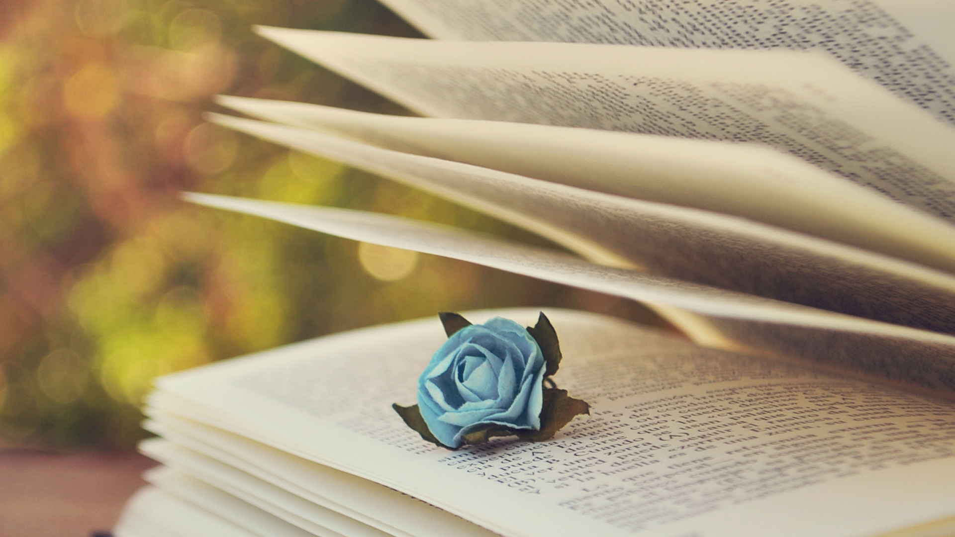 Description: A blue rose sitting on top of a book with pages folded down and a blurry background behind it.