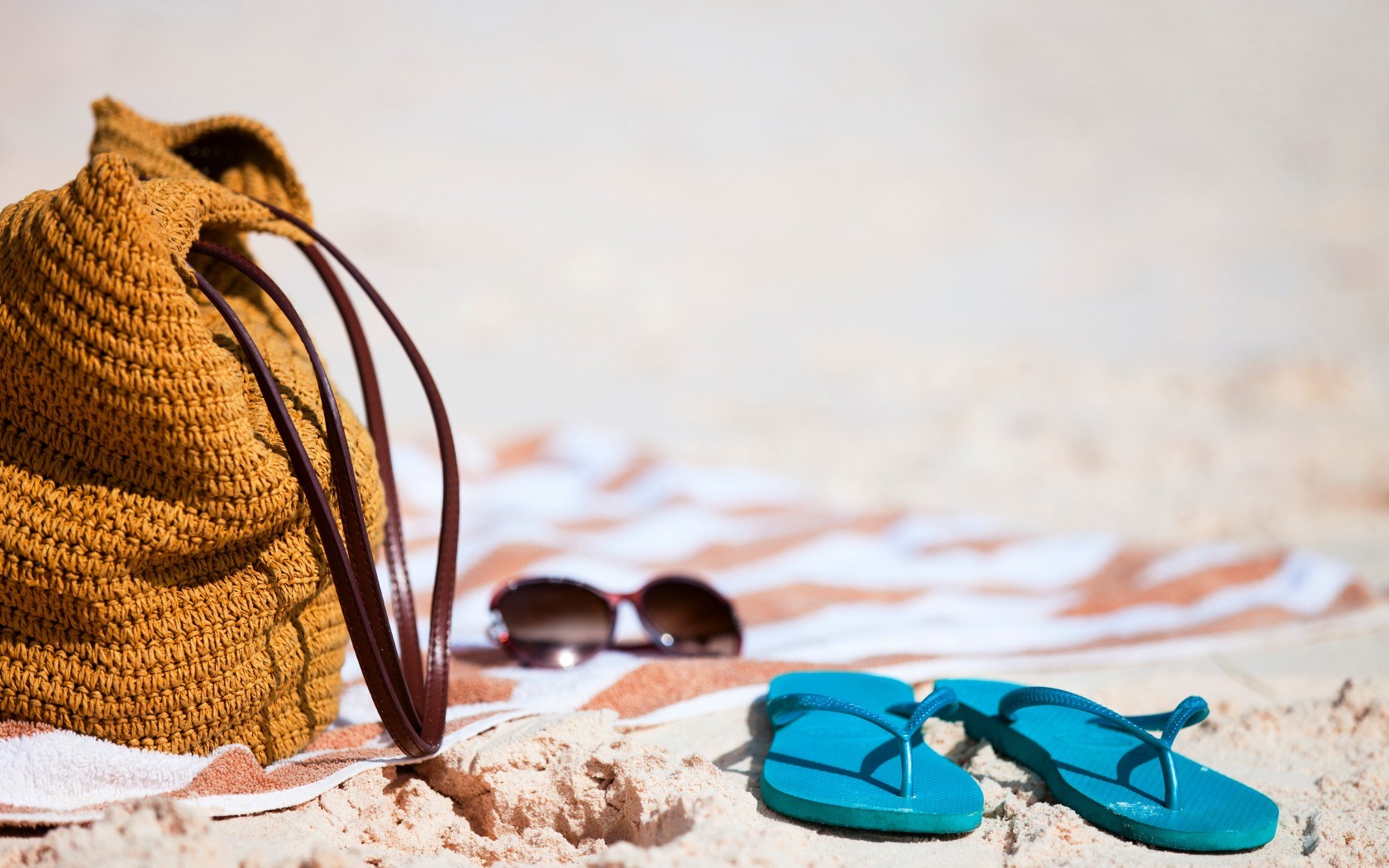 Description: A pair of blue sandals and a straw bag on a beach with a towel and sunglasses on it.