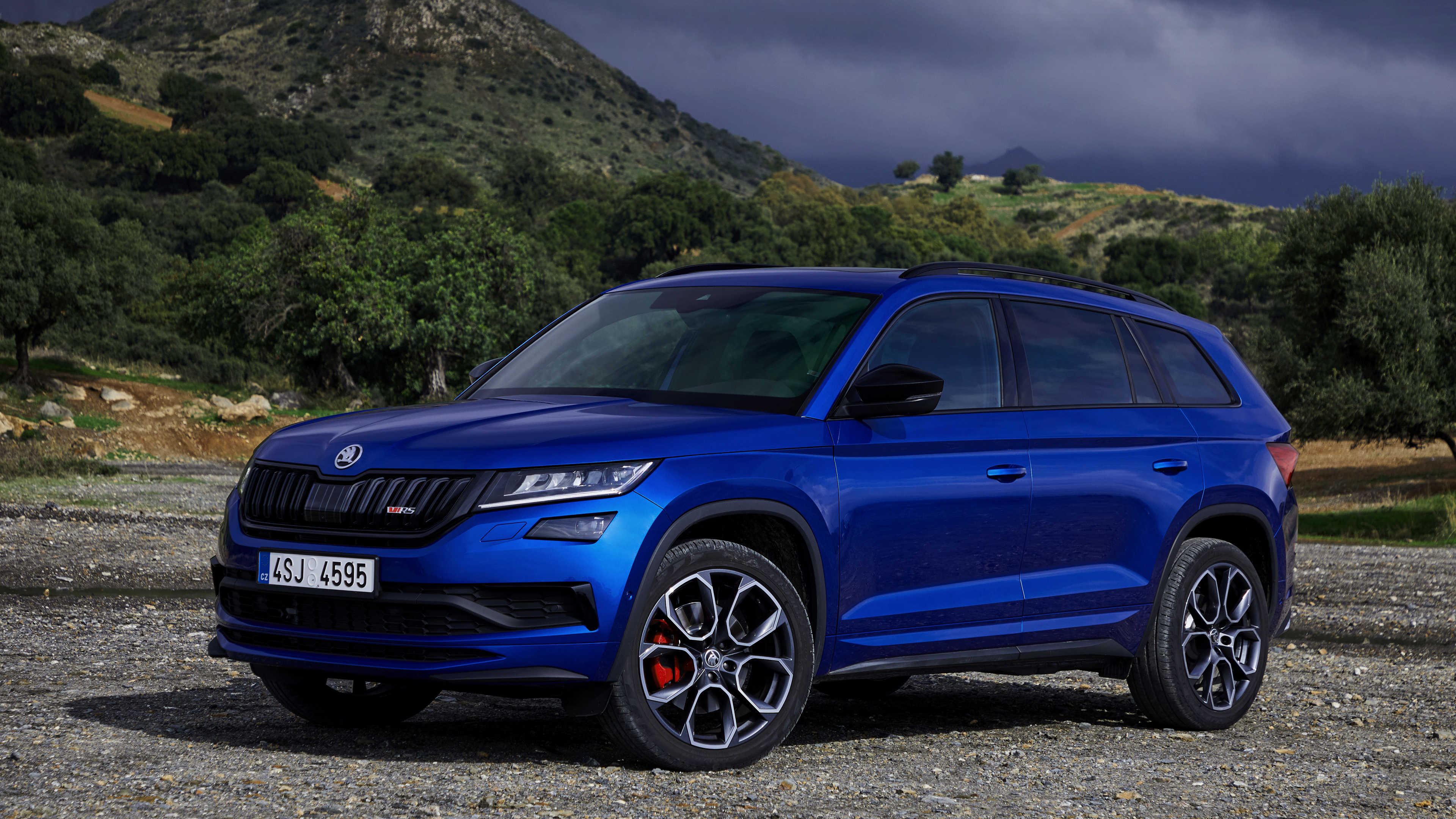 Description: A blue skunk parked in a gravel lot with a mountain in the background and dark clouds overhead in the sky.