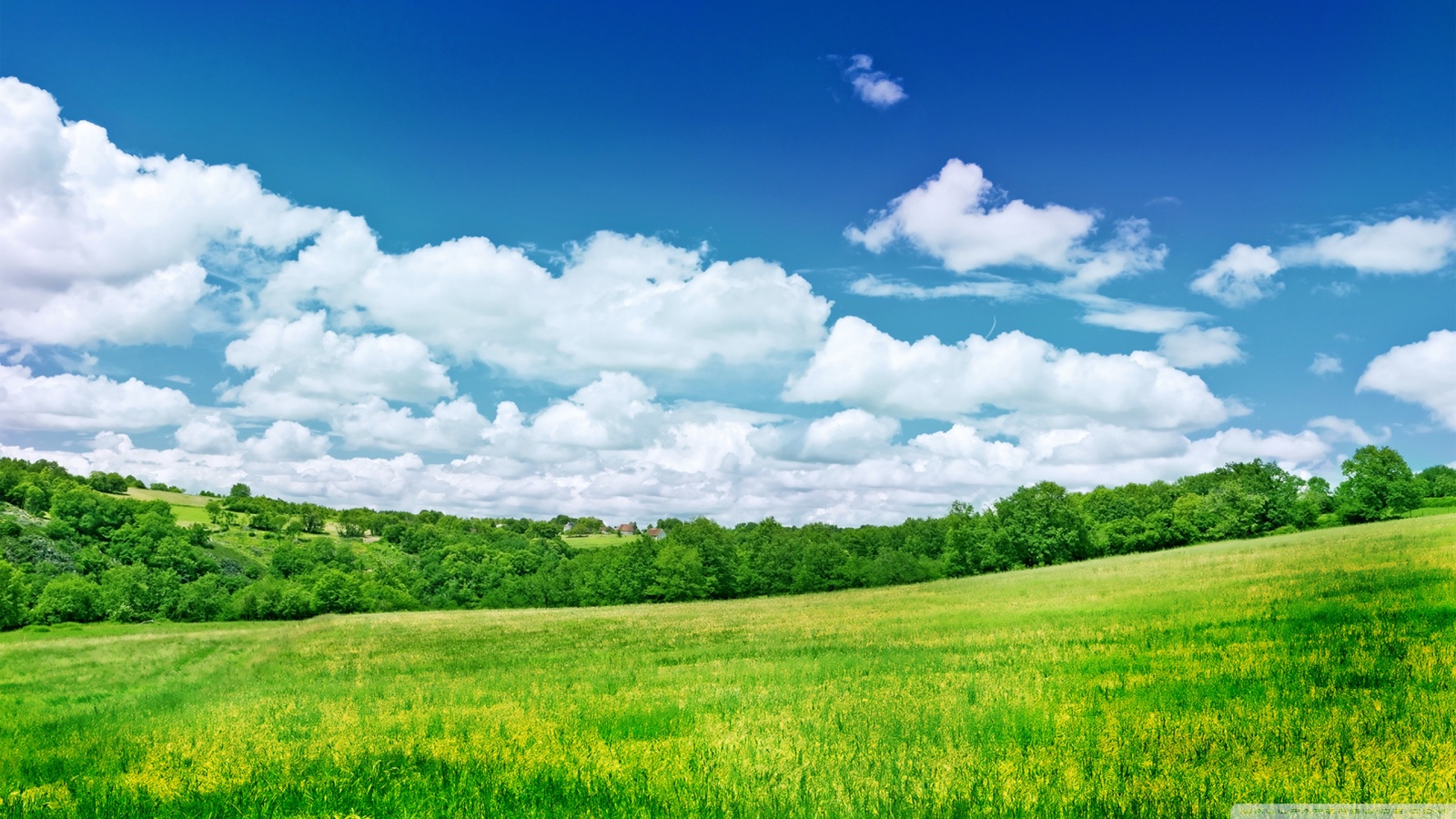 Description: A field with a blue sky and clouds above it and a green field with trees and grass below it.