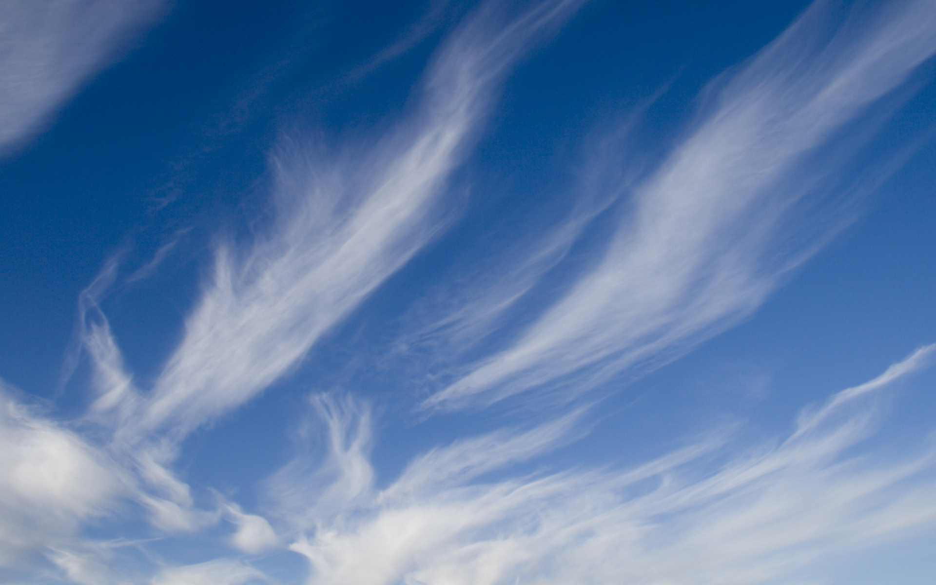 Description: A blue sky with some clouds and a plane in the distance with a plane in the foreground and a plane in the background.
