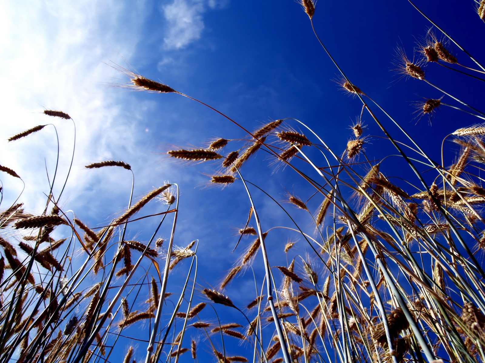Description: A blue sky with some clouds and some tall grass in it and some tall grass in the foreground.