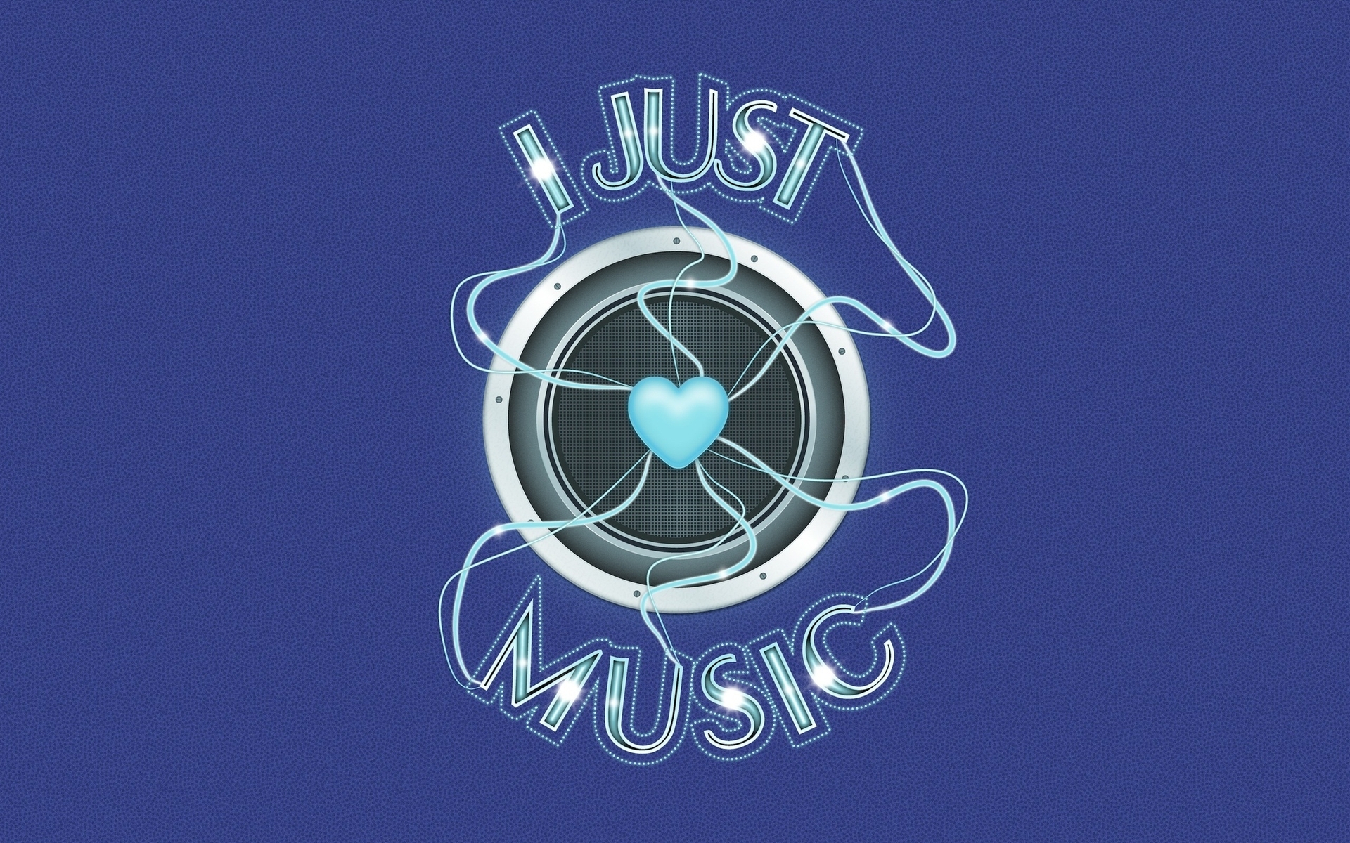 Description: A blue background with a speaker and a heart in the center of it that says just music on it.