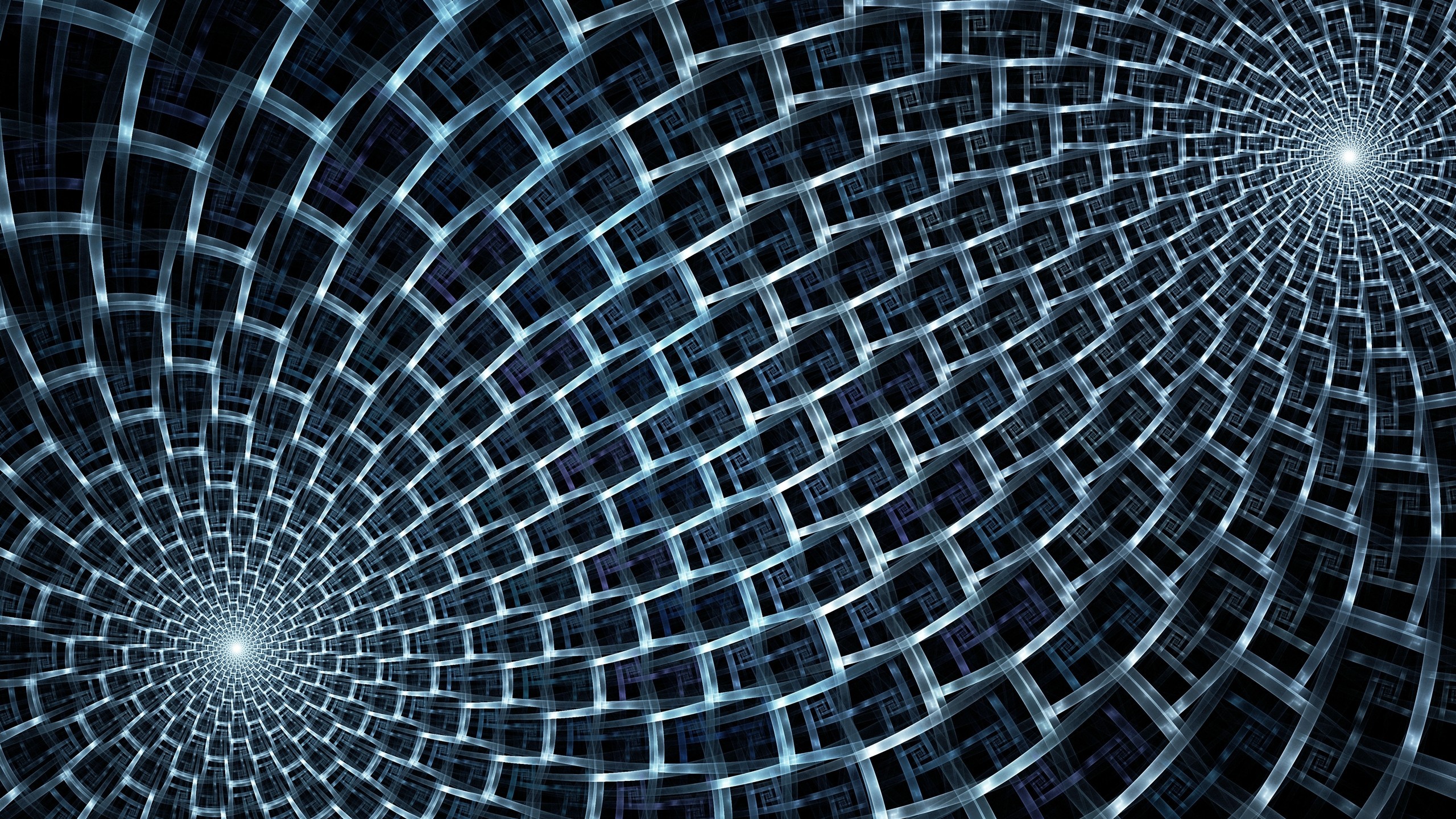 Description: A computer generated image of a blue spiral design with white dots on the center of the image and a black background.