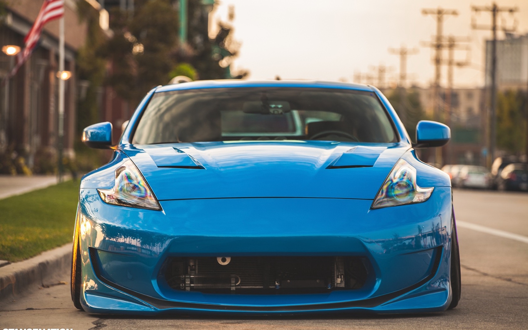 Description: A blue sports car parked on the side of the road in front of a building with american flags on it.