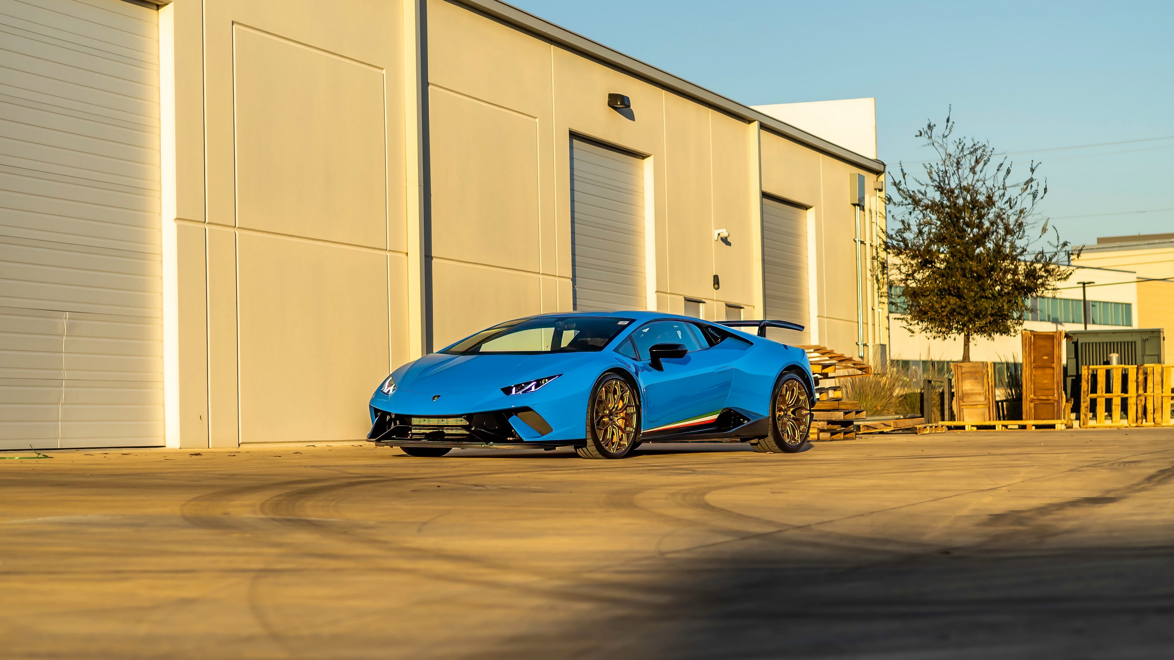 Description: A blue sports car parked in front of a building with a garage door open and a tree in the background.