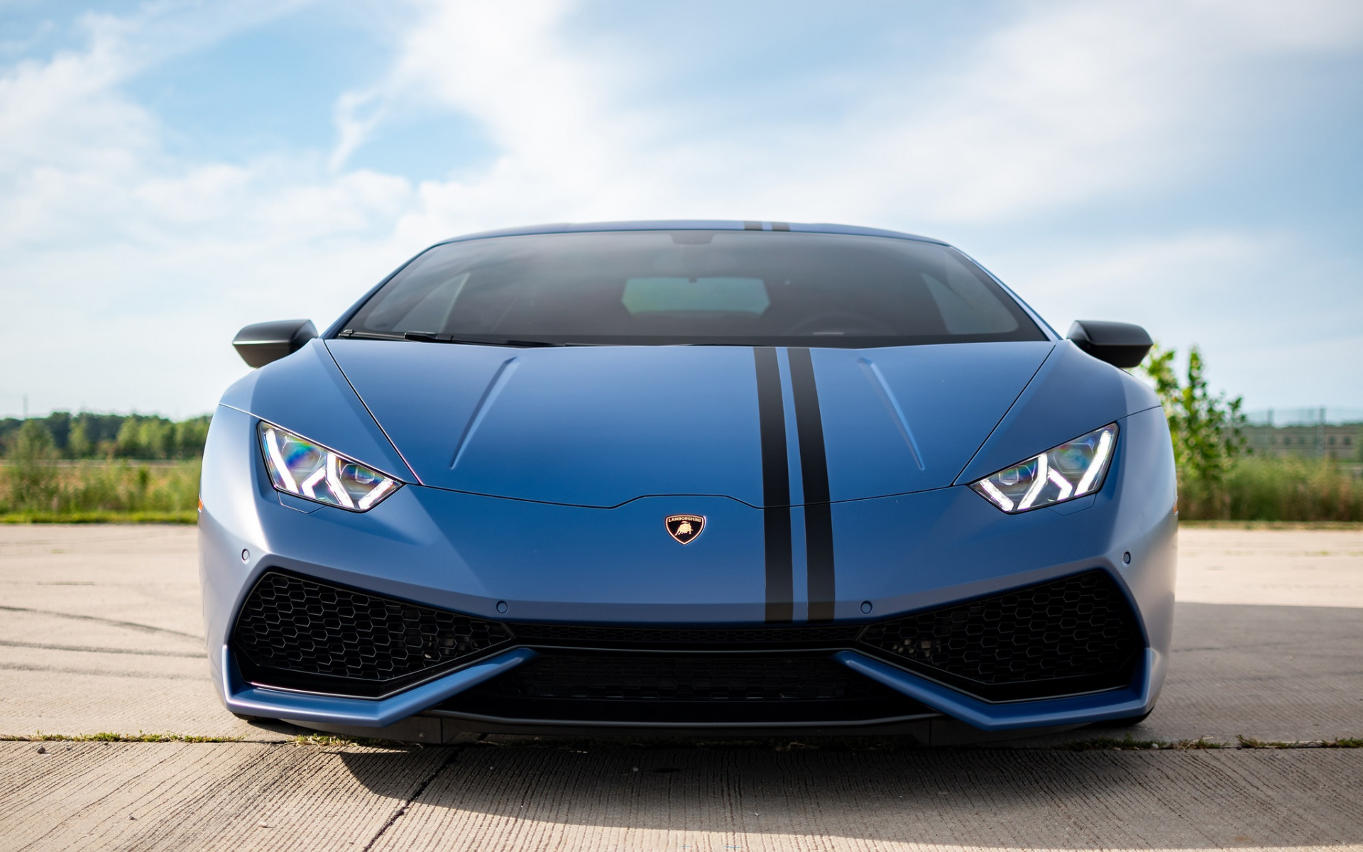 Description: A blue sports car parked on a parking lot with a sky background and clouds in the background.