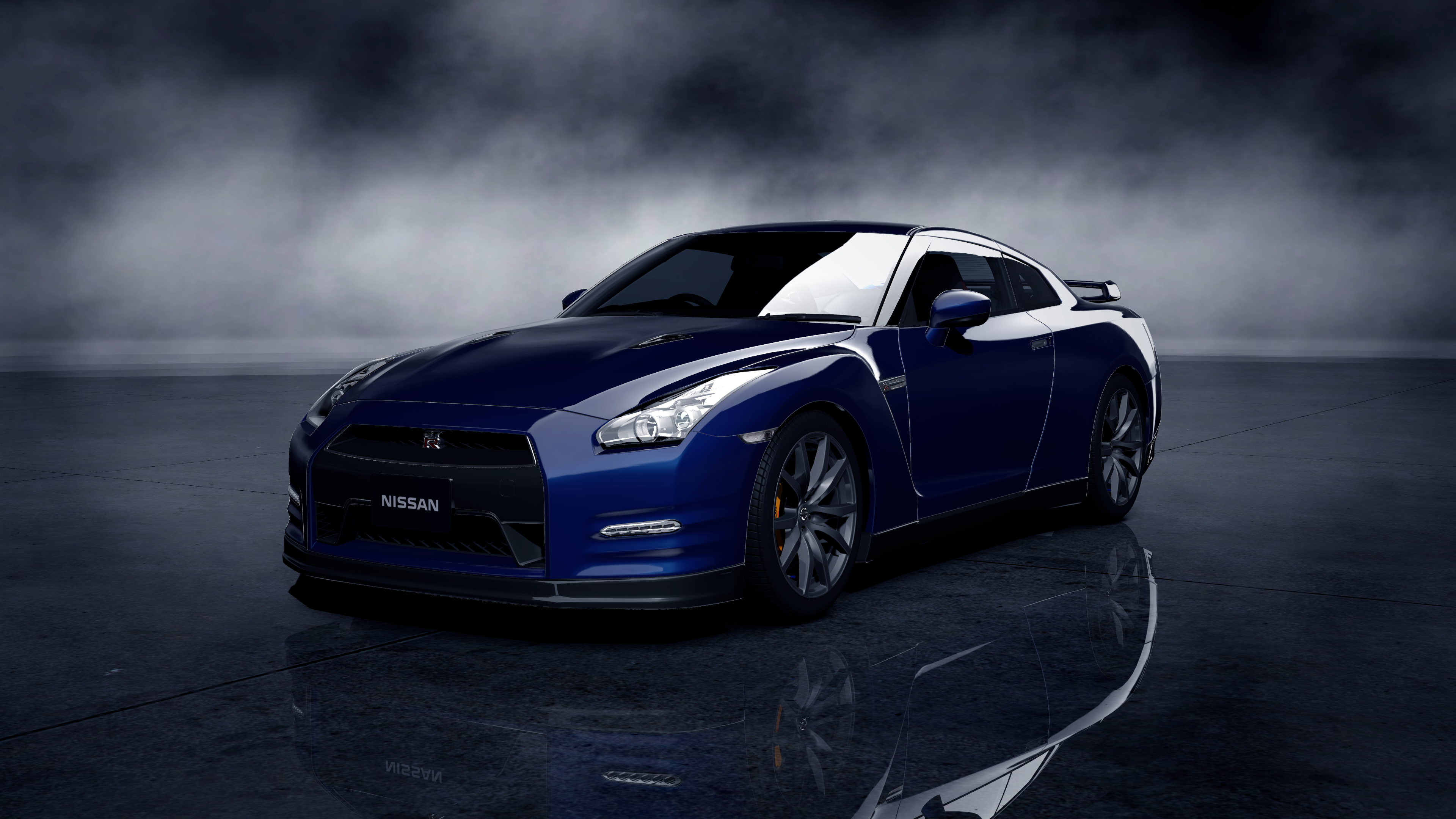 Description: A blue sports car is shown in a dark room with fog and smoke behind it.