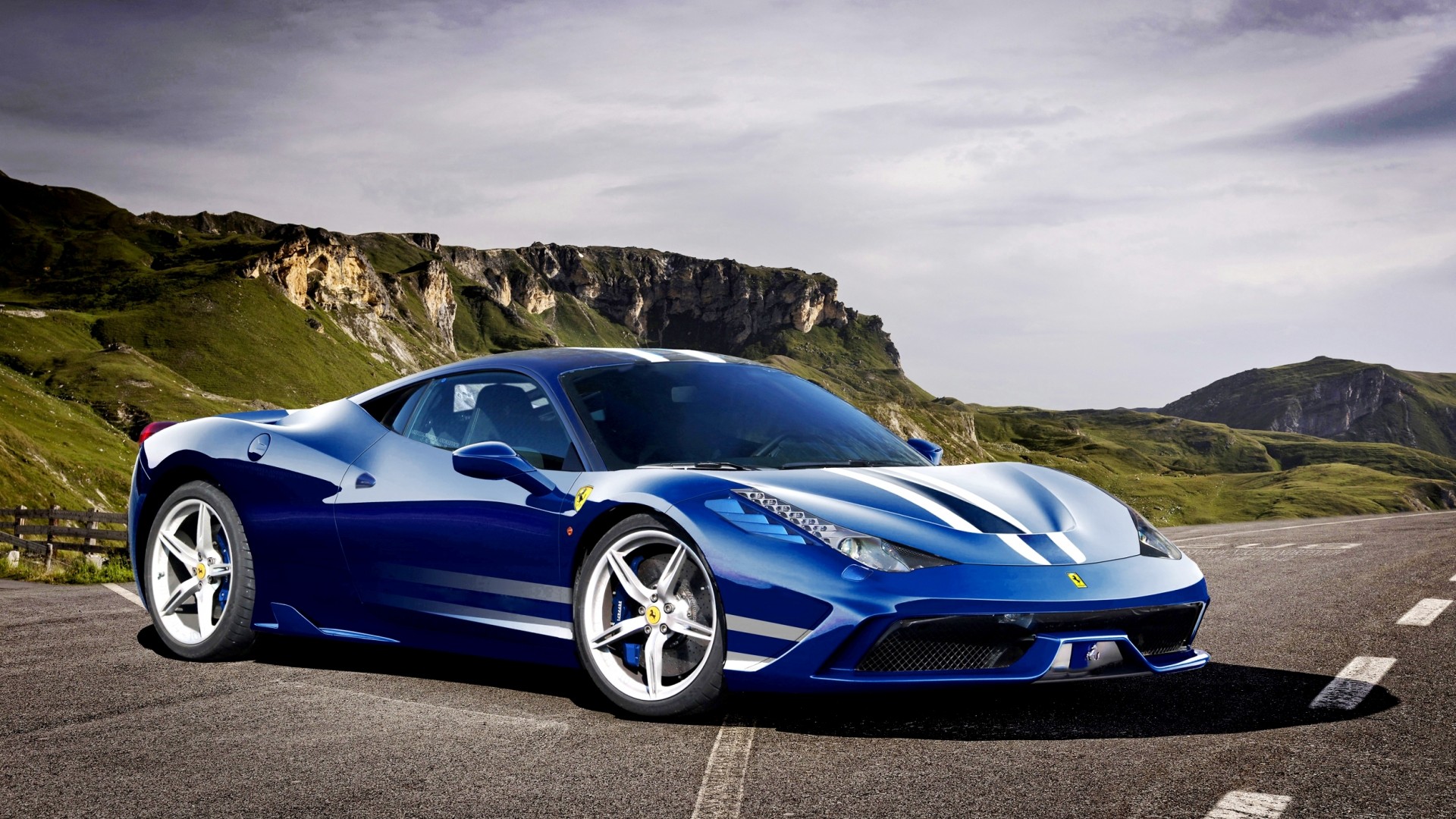 Description: A blue sports car driving down a road next to a mountain range with a cloudy sky above it and a mountain range in the background.