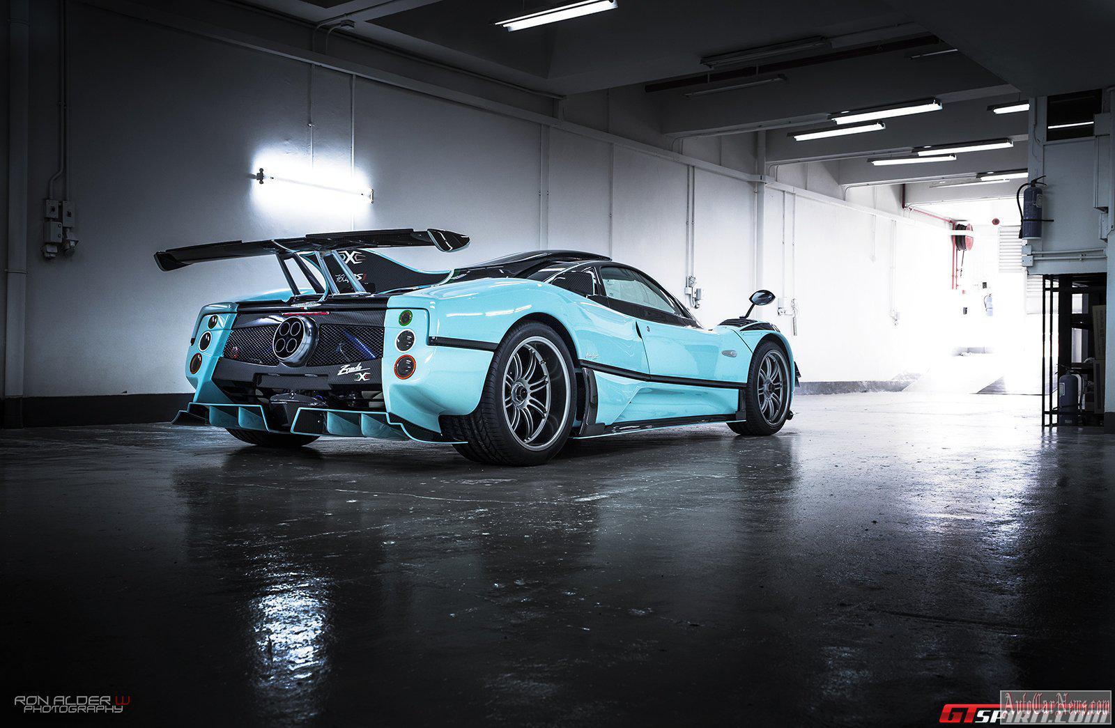 Description: A blue sports car parked in a garage with its doors open and the hood open and the hood down.
