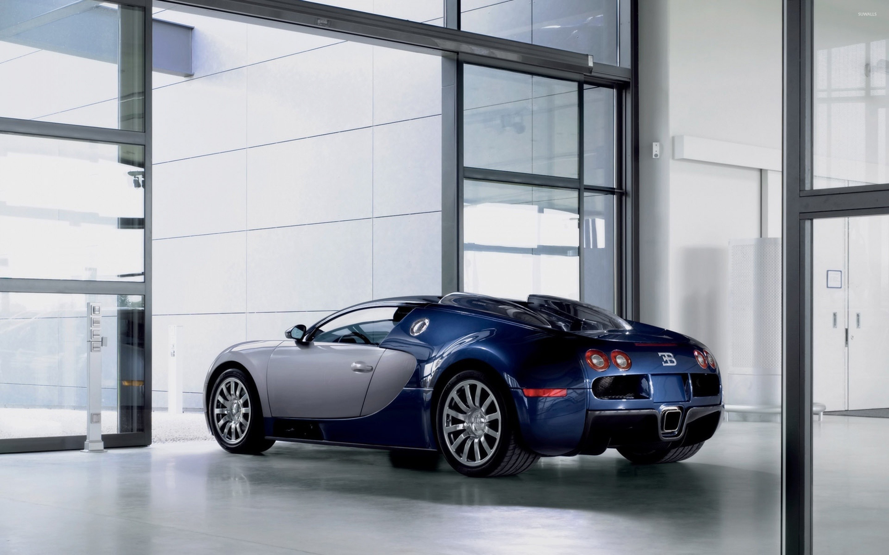 Description: A blue sports car parked in a building with glass doors and windows on the side of it's side.