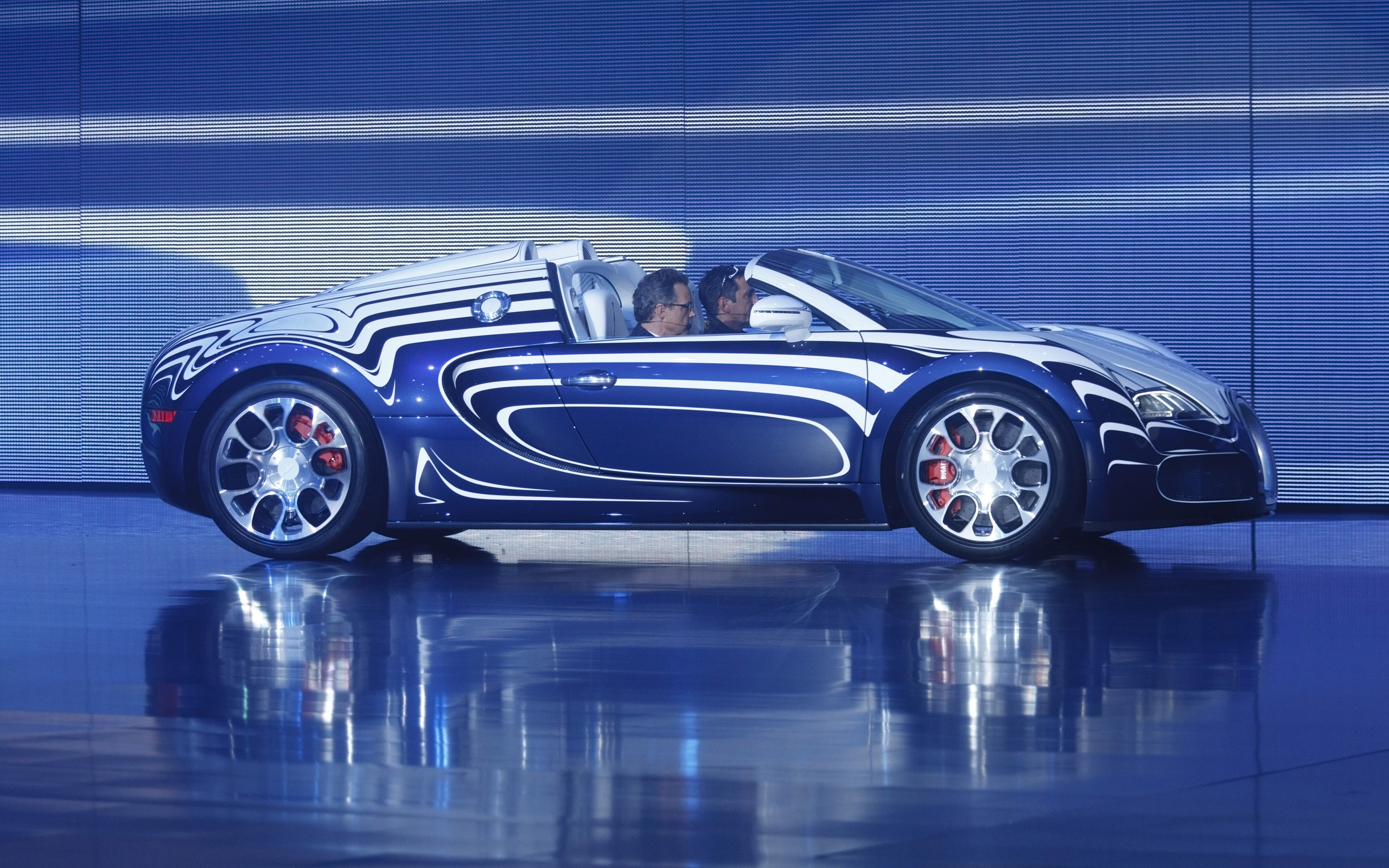 Description: A blue sports car with a man in the driver's seat in front of a blue background with a blue wall.