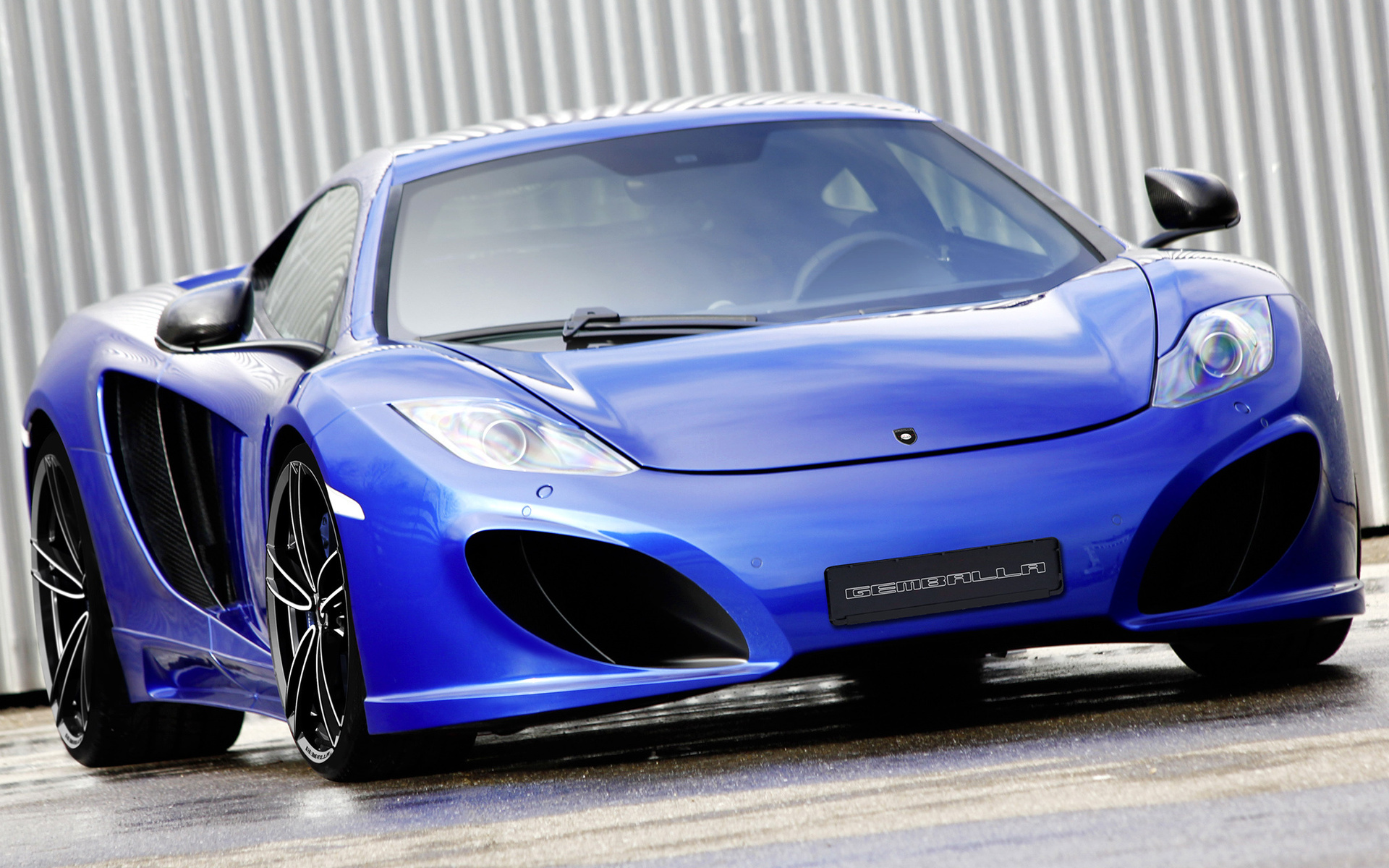 Description: A blue sports car parked in front of a building with a metal wall behind it and a door open.