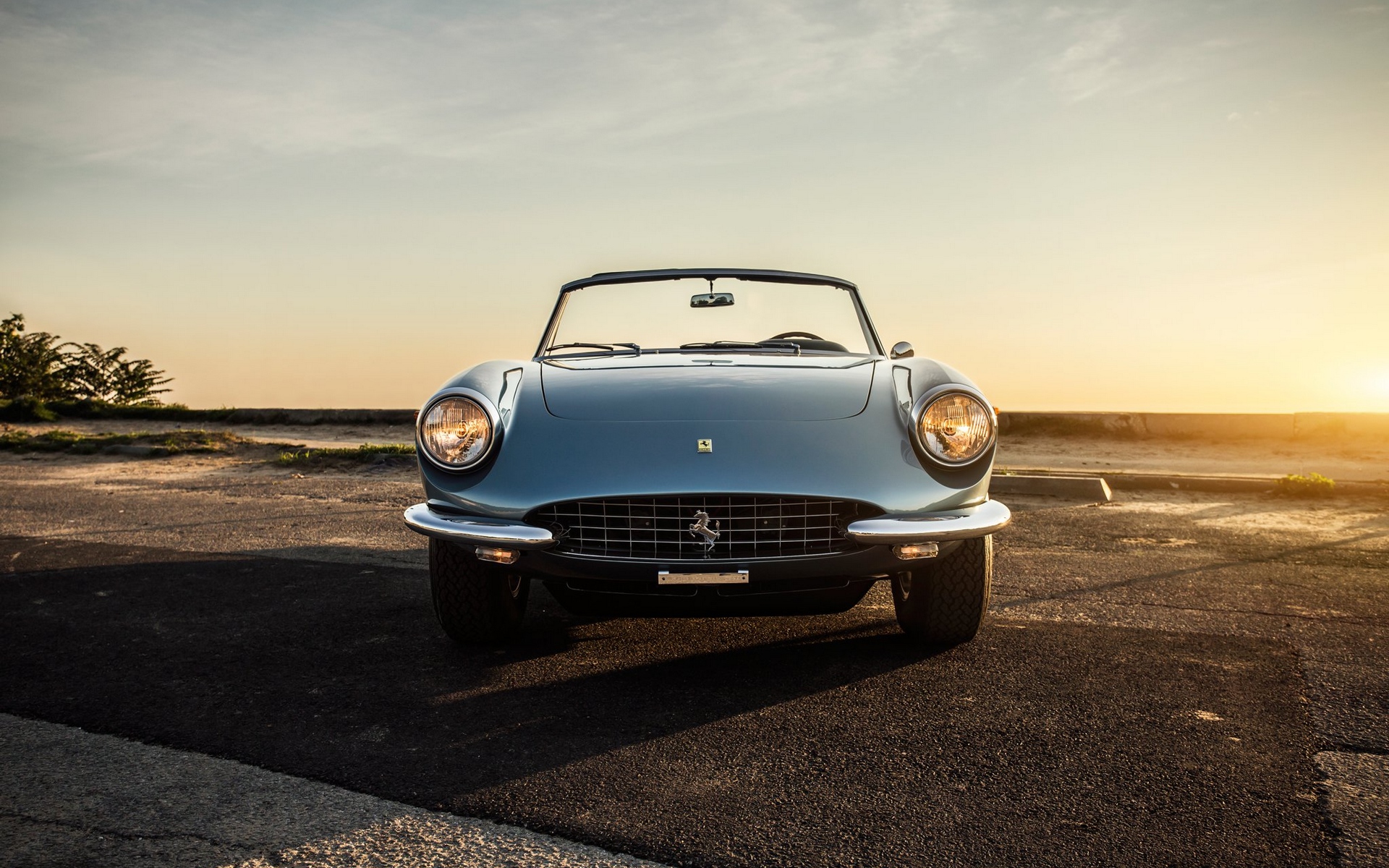 Description: A blue sports car parked on a parking lot at sunset with the sun shining on the horizon behind it.