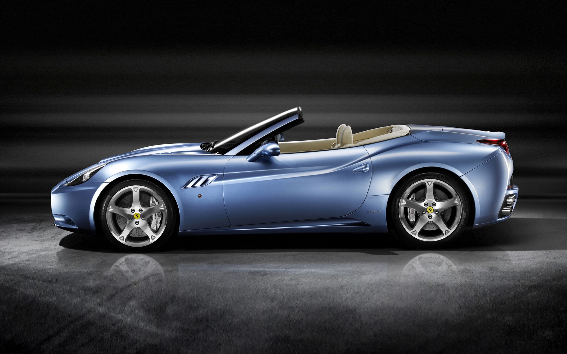 Description: A blue sports car with a tan leather top and tan leather seats is shown in a dark room with a black background.