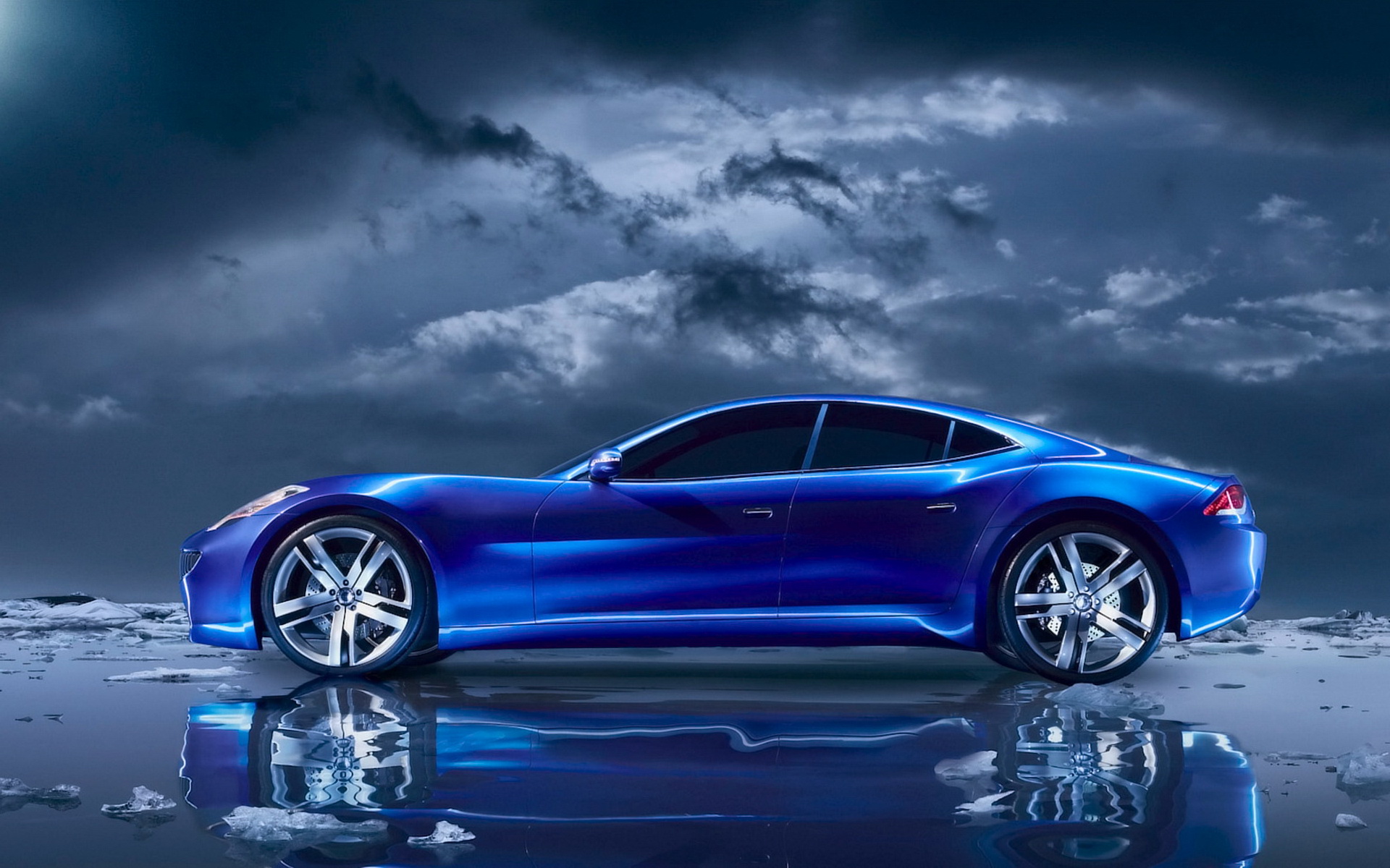 Description: A blue sports car is parked in the water under a cloudy sky with a full moon in the background.