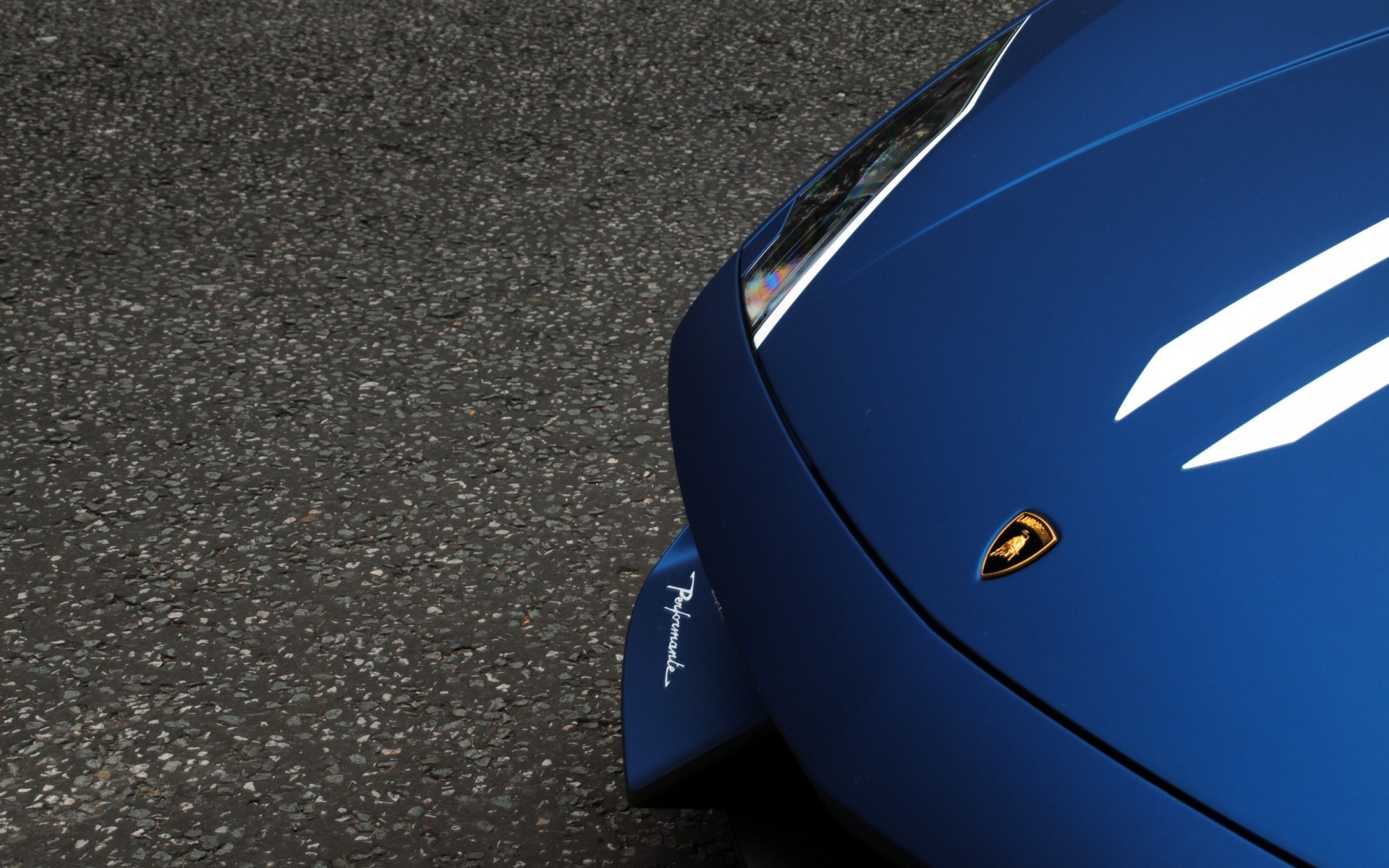 Description: A close up of a blue sports car with a yellow emblem on it's hood and a black background.
