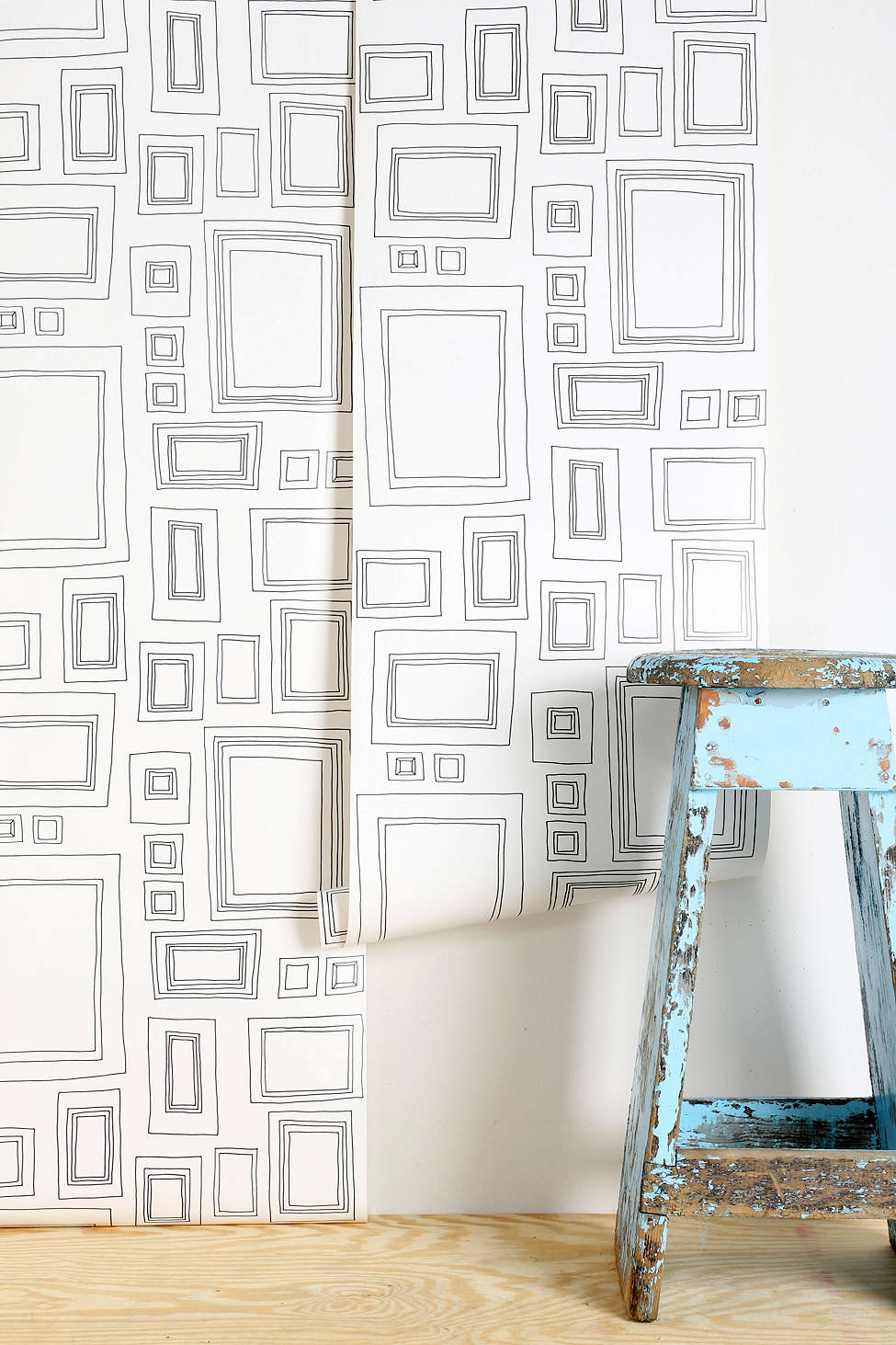 Description: A blue stool sitting next to a wall with a pattern on it and a white wall paper behind it.