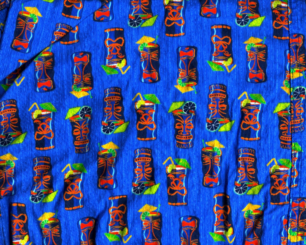 Description: A blue background with a pattern of tiki masks and a green leafy plant on it.