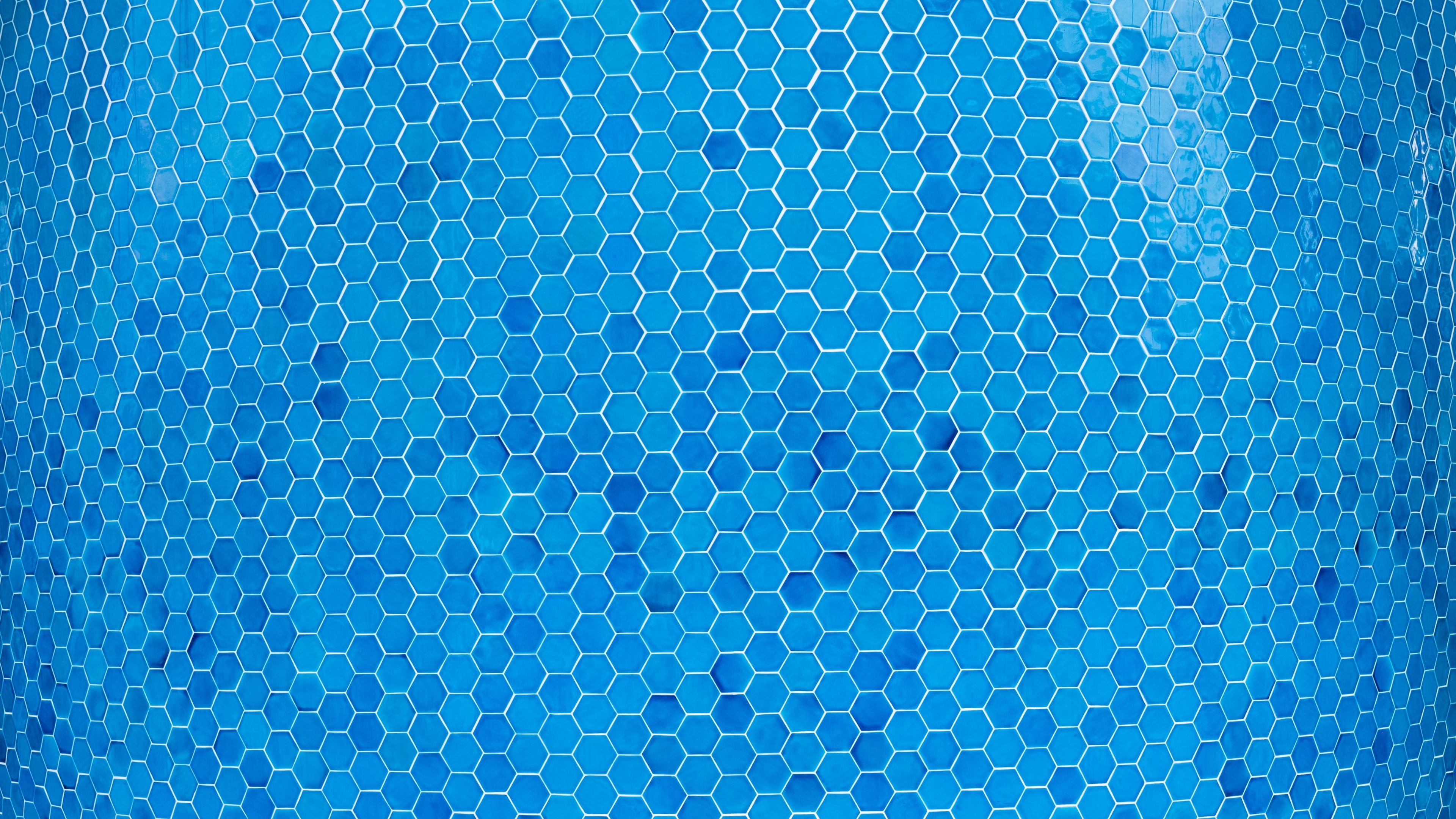 Description: A blue tiled wall with a blue umbrella in the middle of it and a blue umbrella in the middle of it.