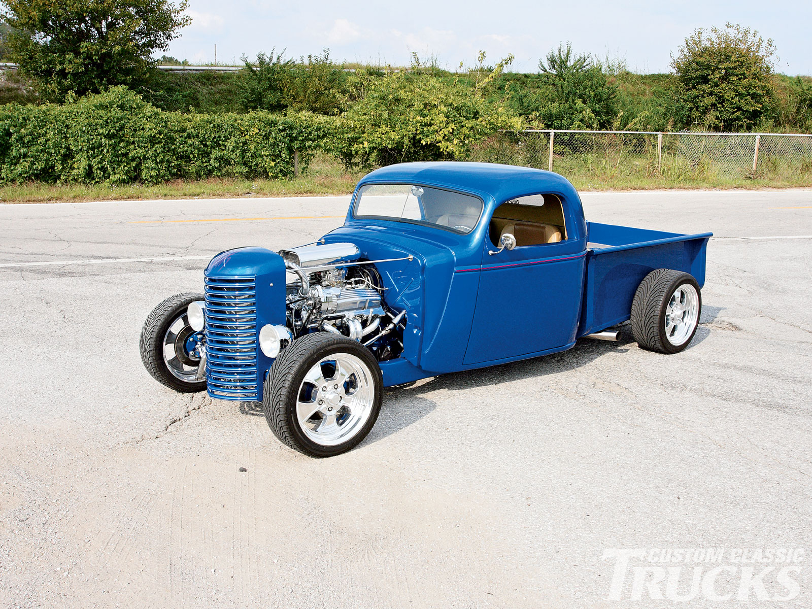 Description: A blue truck parked on top of a parking lot next to a fence and trees and bushes behind it.