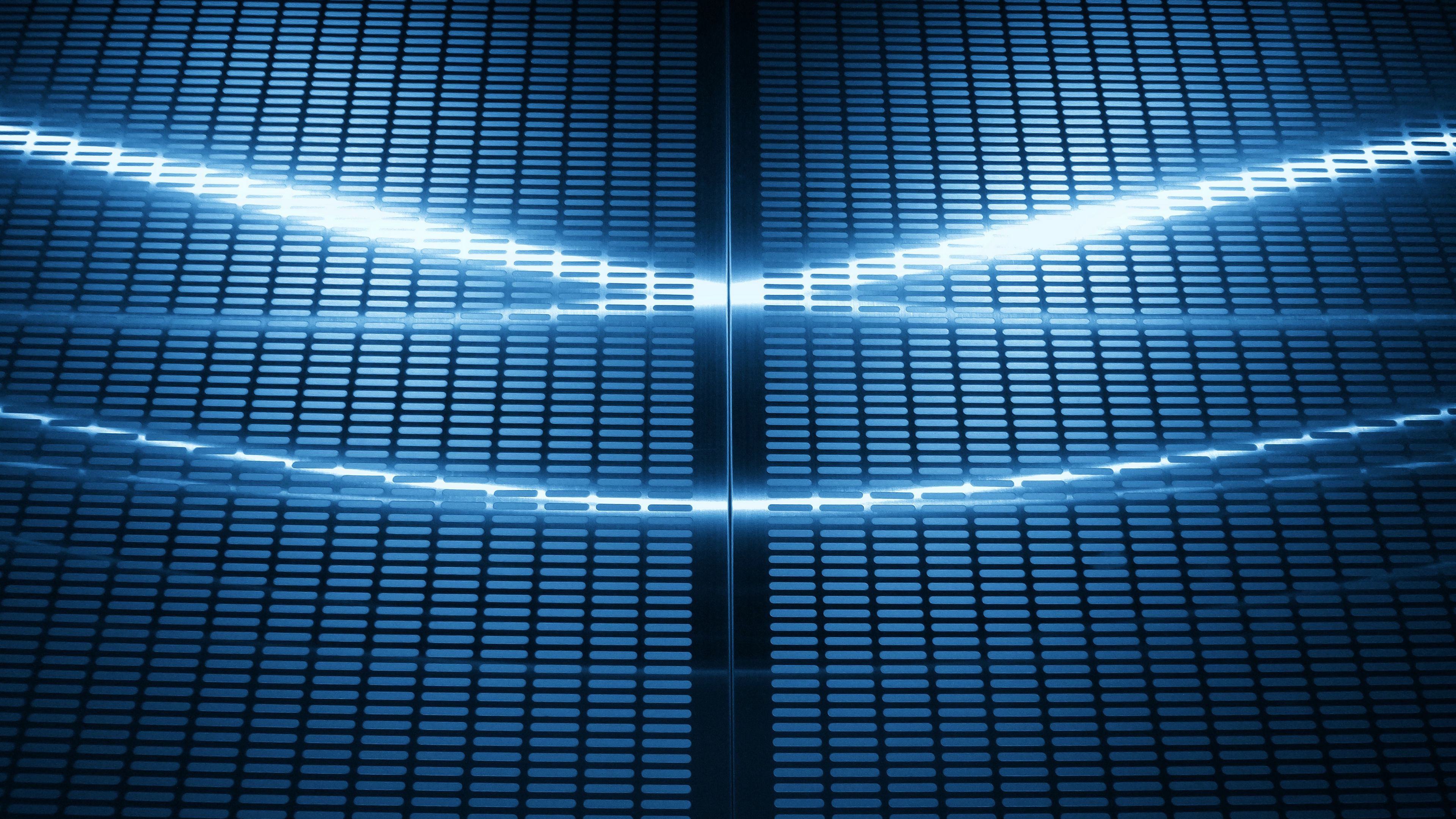 Description: A blue background with a wave of light coming out of it's center and a black background with a white line.