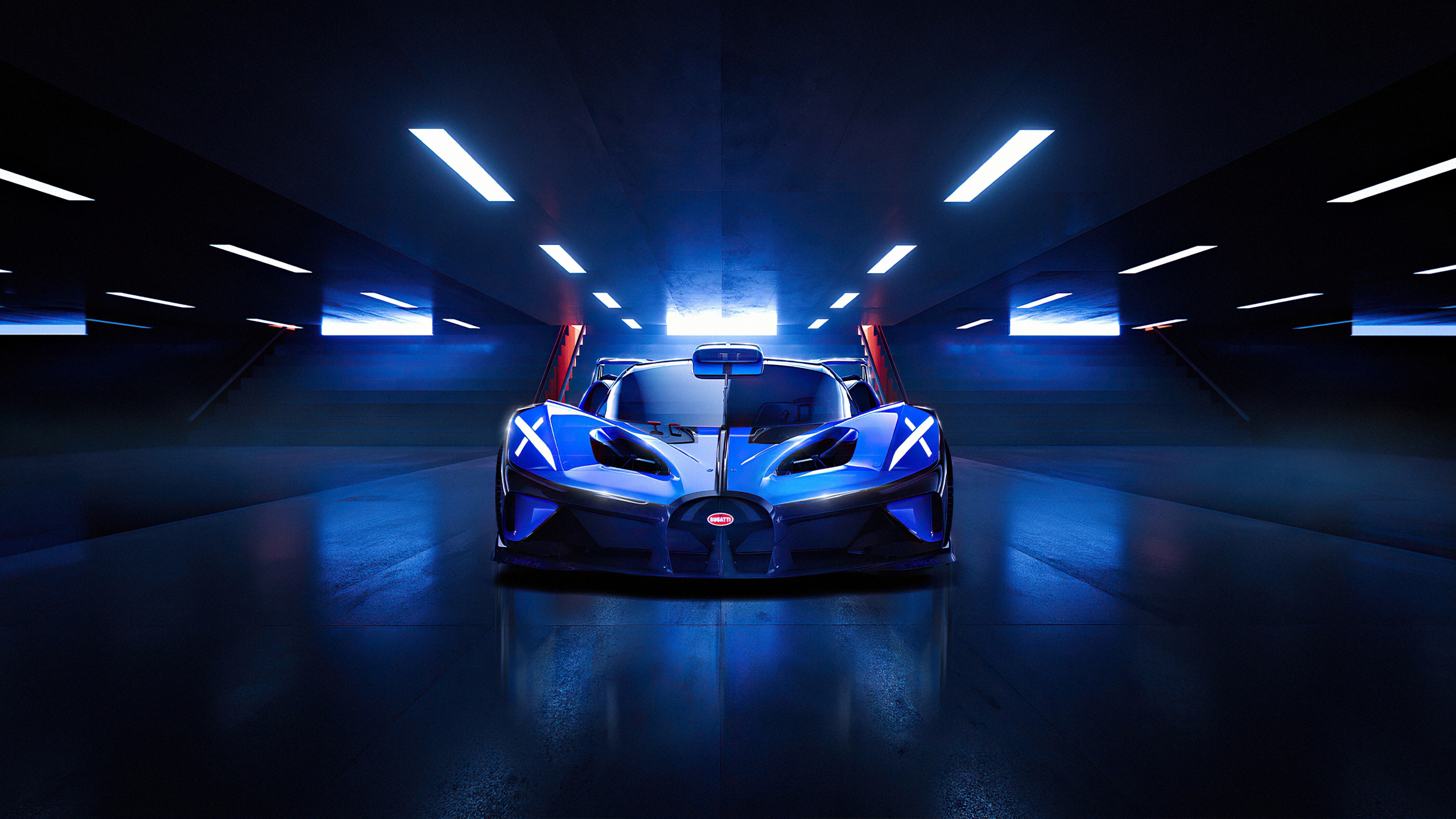 Description: A blue and white car in a dark tunnel with lights on it's sides and a black floor.