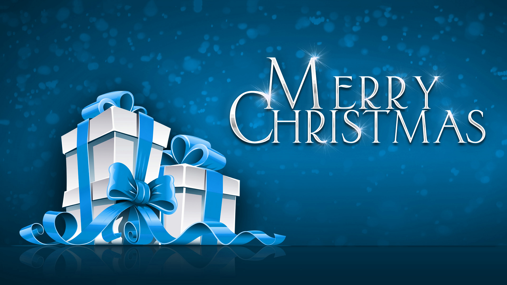 Description: A blue and white christmas card with presents on it and a merry christmas message on the back of the card.
