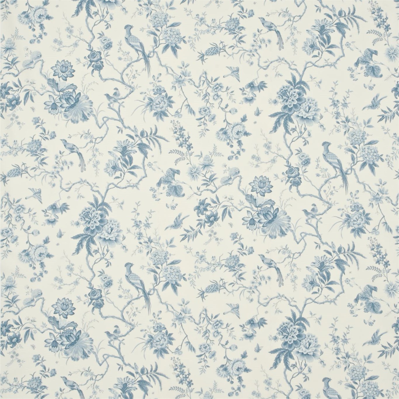 Description: A blue and white floral pattern on a white background with a blue border of flowers and leaves on the bottom of the image.