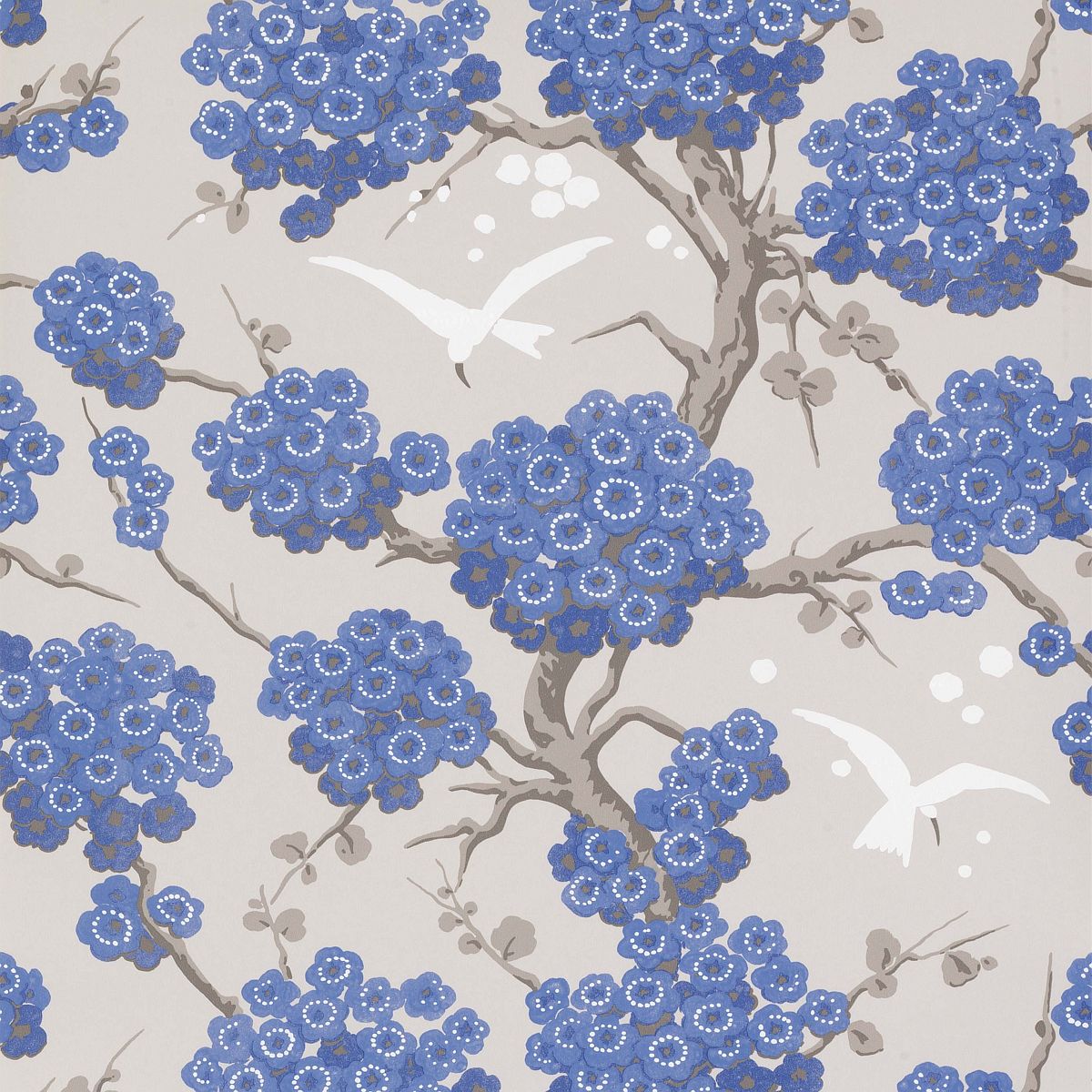 Description: A blue and white flowered wallpaper with birds flying around it and a tree with blue flowers on it.