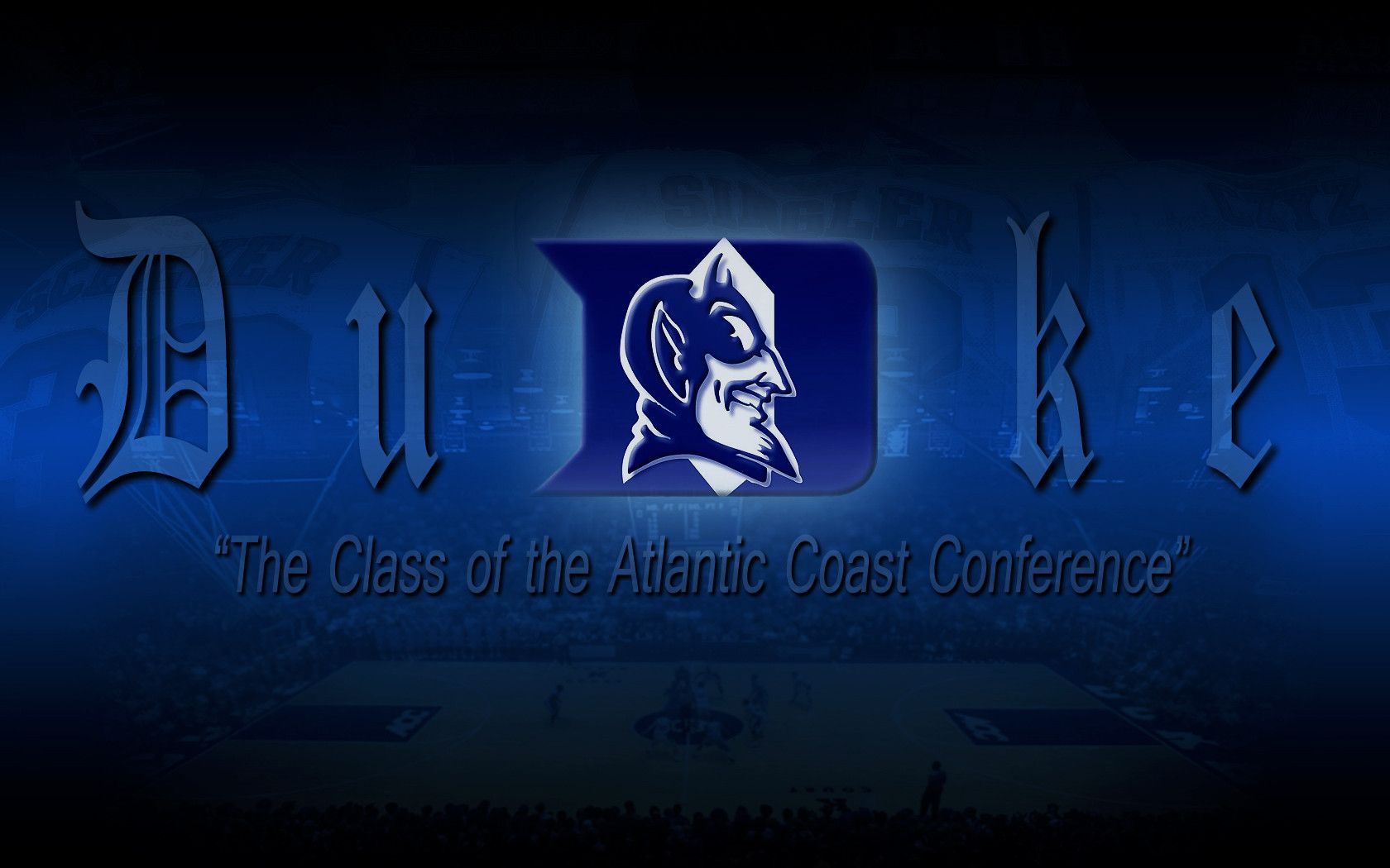 Description: A blue and white logo with the words duke on it and a basketball court in the background with a blue and white logo.