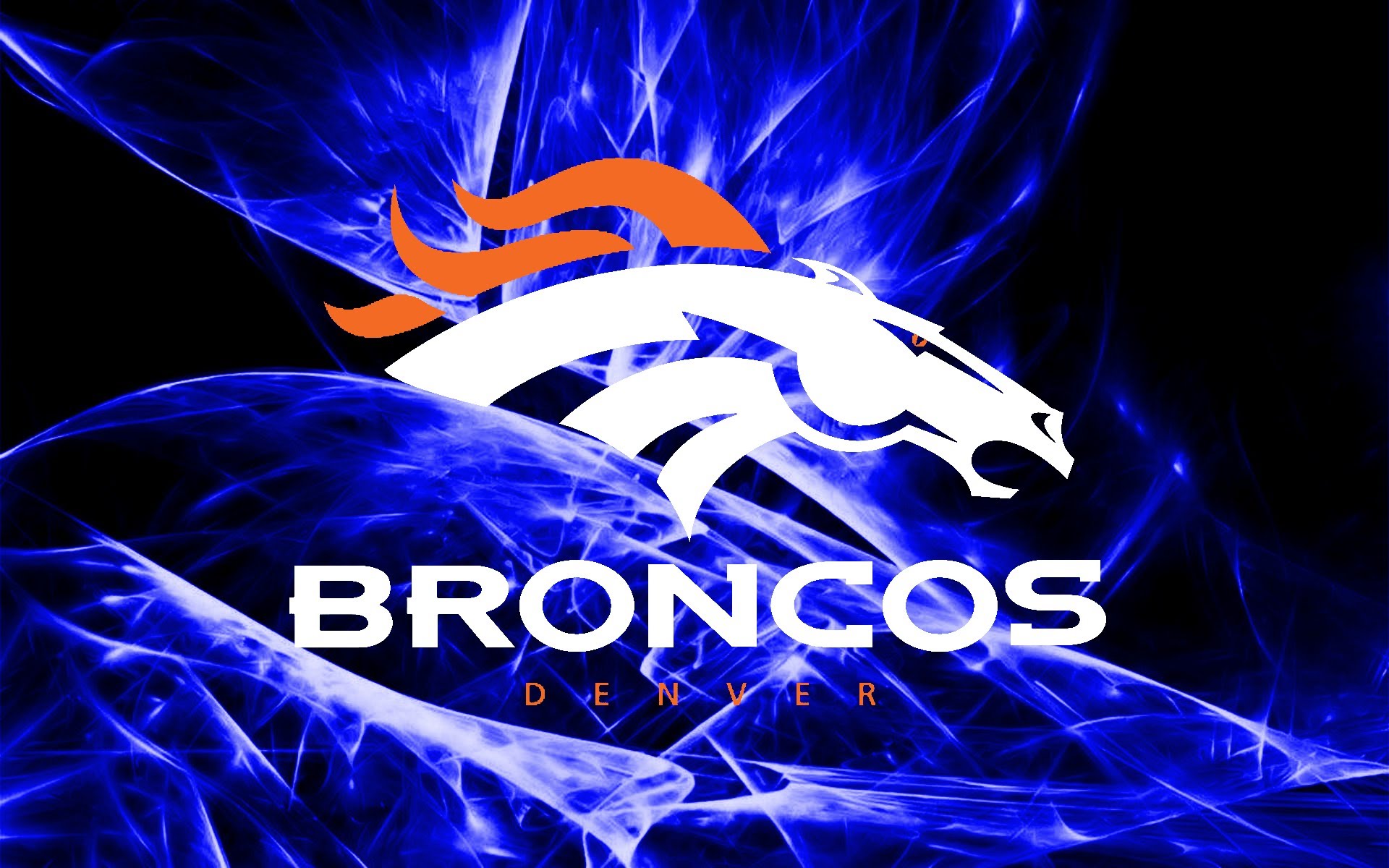 Description: A blue and white logo with a red dragon on it's head and the words broncos denver.