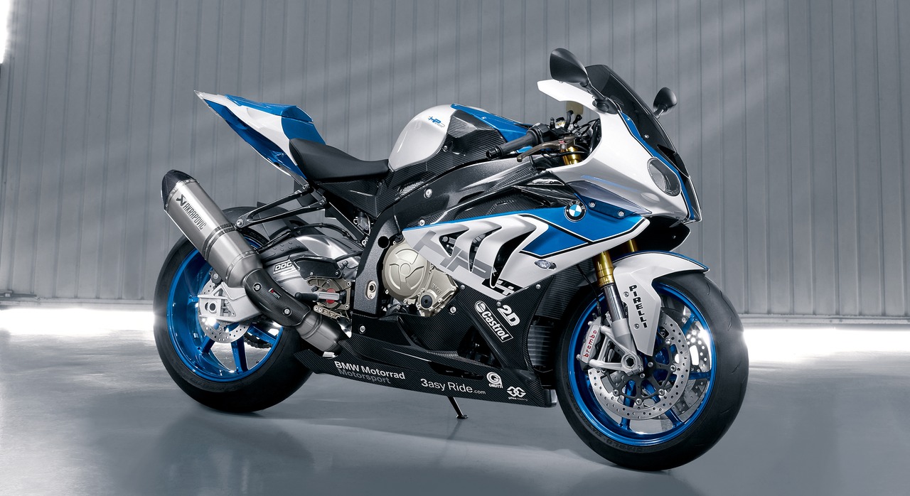 Description: A blue and white motorcycle parked in a garage area with a wall behind it and a door behind it.