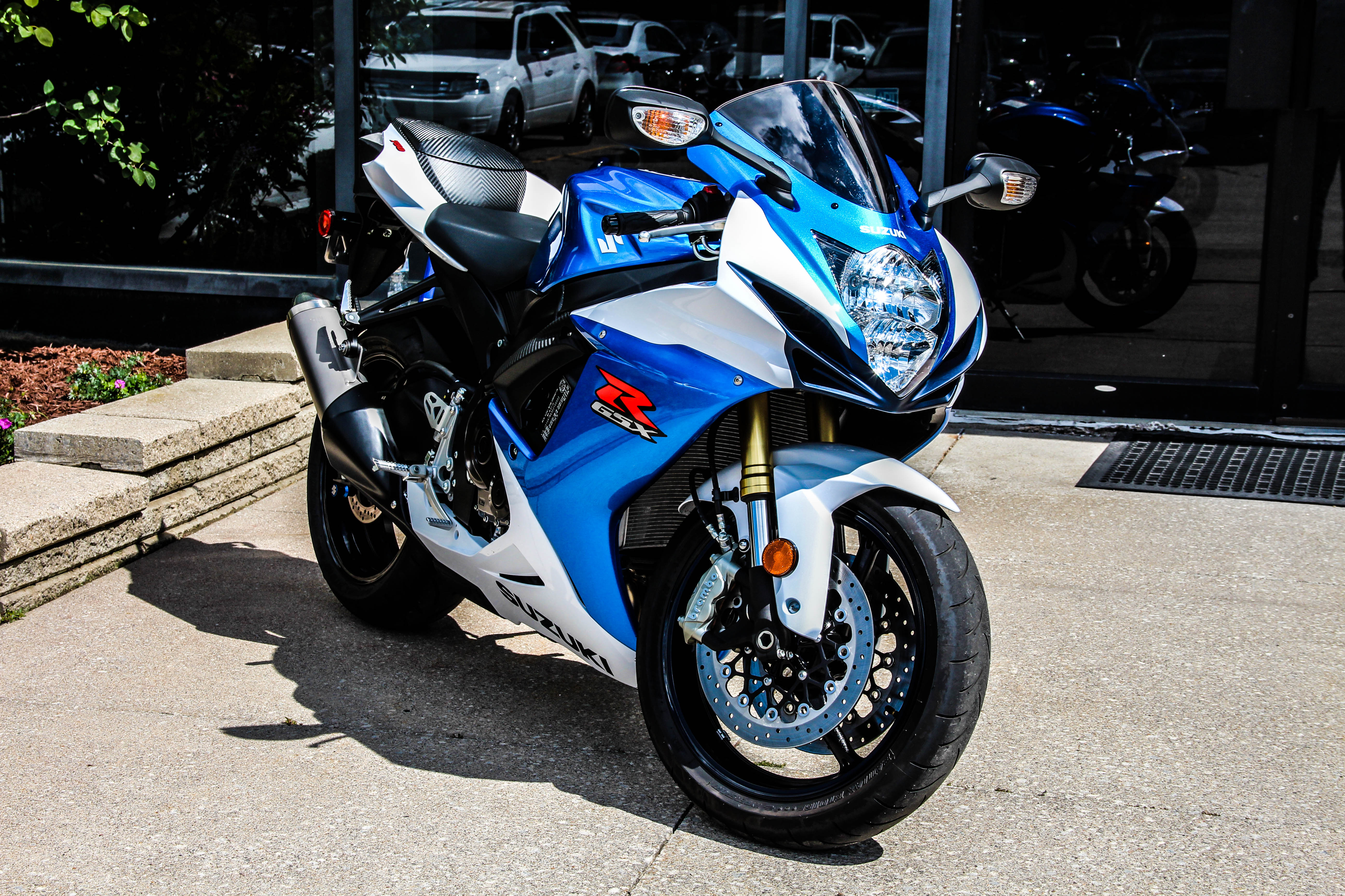 Description: A blue and white motorcycle parked on a sidewalk next to a building with a car in the background and a tree in the foreground.