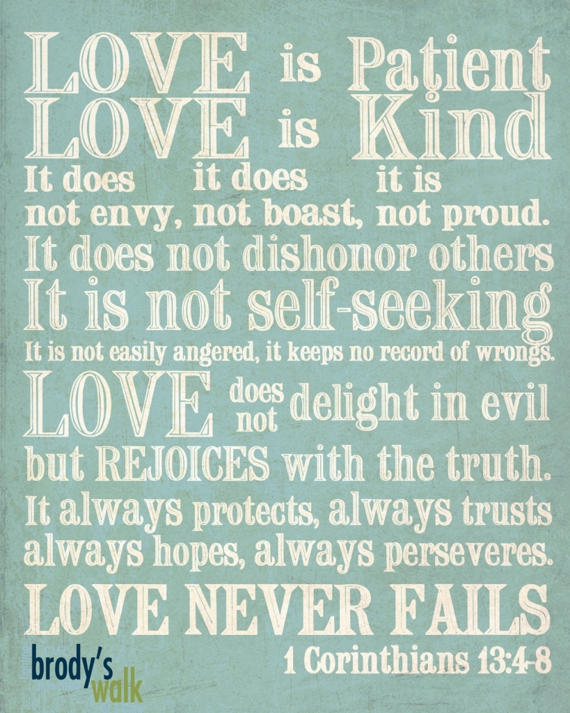 Description: A blue and white poster with a quote from the bible love is patient love is kind of not very.