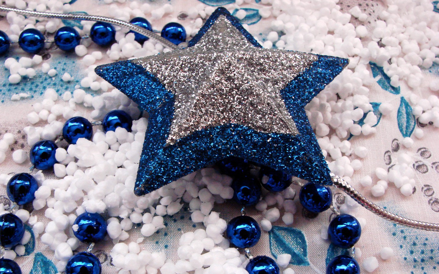 Description: A blue and white star ornament surrounded by beads and beads on a table cloth with a blue and white star.